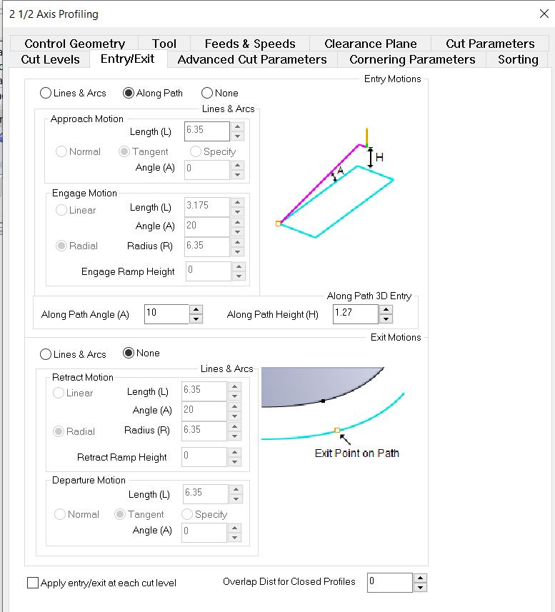 When you are profling, there are different ways that the machine will approach the cut. Meaning from home, the machine will move the end mill either directly into the material perpendicularly or make a slope into the material. To decrease the load and tension on the end mill a good setting to use is the sloping. In sloping there are also two ways that it can approach the starting point, either along the curves actual path, or while it is in motion towards the curve. To avoid any random cuts in our material, it is best to use the option that is along the actual curve. To get to this setting you need to go into, Entry/Exit > Along Path . Now you have the approach to your cut safely set up. As for the exit, there is less tension or load for when the end mill is leaving the material, especially that I am using an up-cut, and for that reason will allow it to directly leave the material perpendicularly.