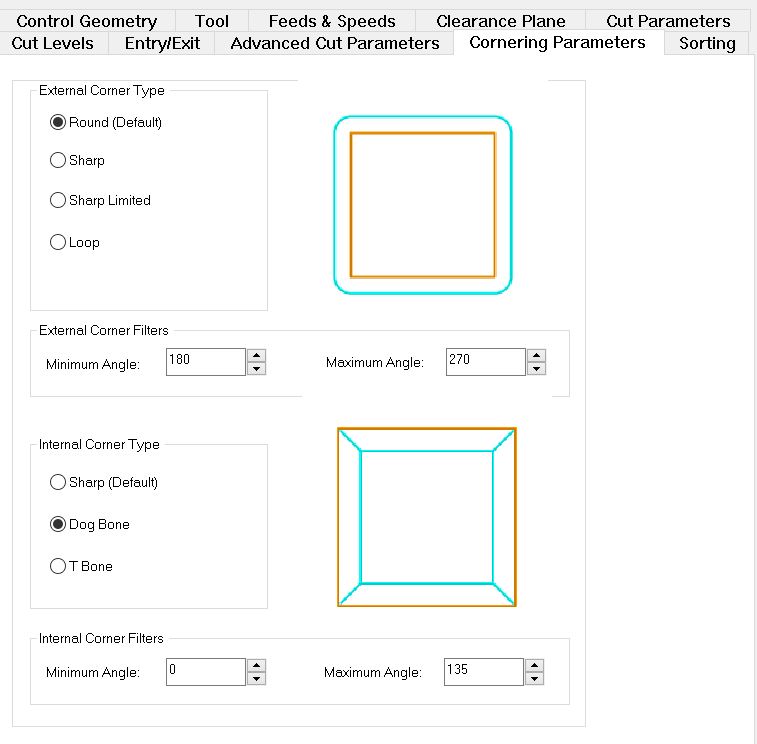In the cutting process, you may find that some inside corners that you have in your design are simulating or cutting as semi-circles rather than with corners, which happens because of the nature of the circular milling bits. The solution for such a problem is using DogBones or T-Bones. To learn more about inside corner, why they happen, and dog bones visit The Inventables Workshop's Blog Dogbones are more commonly used and, in short, they are a way to allow for the designed corner to exist without having exactly physical lines meeting, they round the corners and pull them out midway. In this version of RhinoCam 2020, there is an automatic selection of the DogBones. To reach that setting go to, Cornering Parameters > Internal Corner Type > Dog Bone