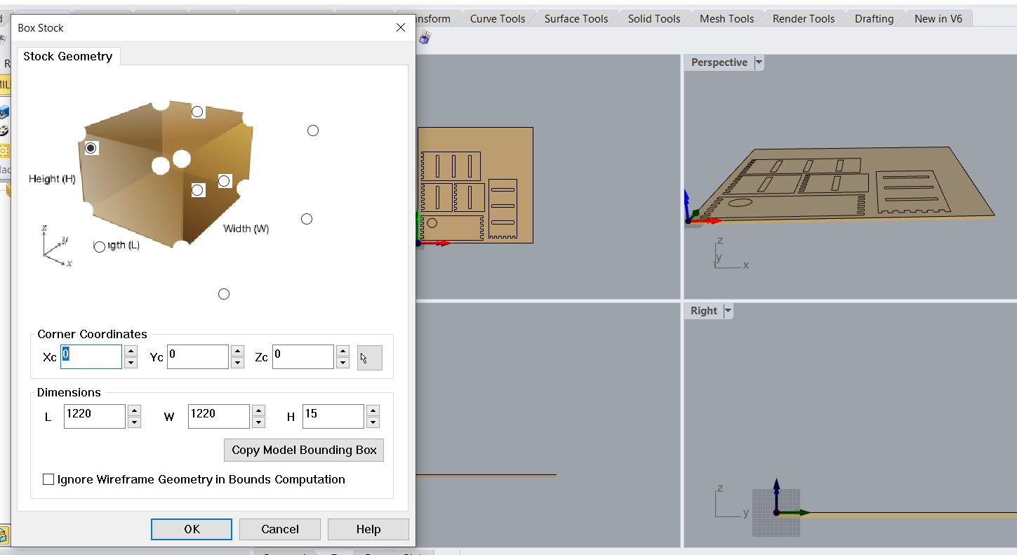 - Stock: make sure corner coordinates are at 0, which is where the machine will begin its calculations, and that the material size is the correct size, which is the bounding box.