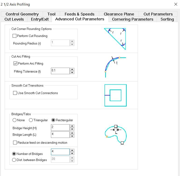 Once the cutting has reached its last few layers and because of the speed and torque, there is a tendency for the object being cut to fly or lift with the end mill. For that reason, there needs to be a safety measure. One measure is to leave rectngular or triangular tabs in a few locations of the piece or to keep an onion skin layer at the bottom of the piece. Tabs can be easily cut and sanded after the piece is done and onion skin can be easily cut by hand. For this design, we will be using tabs. To reach the tab menu go to, Advanced Cut Parameters > Bridges/Tabs > Rectangular For extra safety measures make sure to have 4 tabs under Number of Bridges.