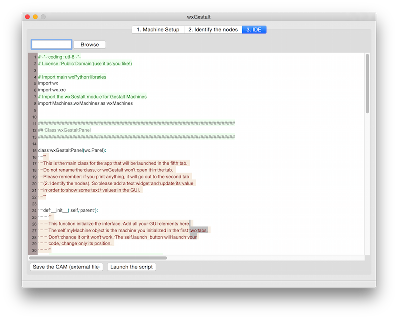 The third tab is the IDE: you can write the Python code that will control the machine. The IDE loads by default a template (see below), but you can open any Python file and save your script as a Python file. When you save the machine (File > Save the machine) the code will be embedded in the machine file, so you can reload in the future. The machine file is a JSON file, so if you want to edit your Python file in another IDE, you'd probably want to save the script as an external file and then load it. When you click on the "Launch the script", a new tab will be opened. That tab will be generated from your code!