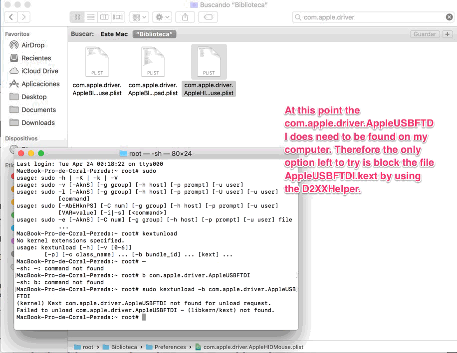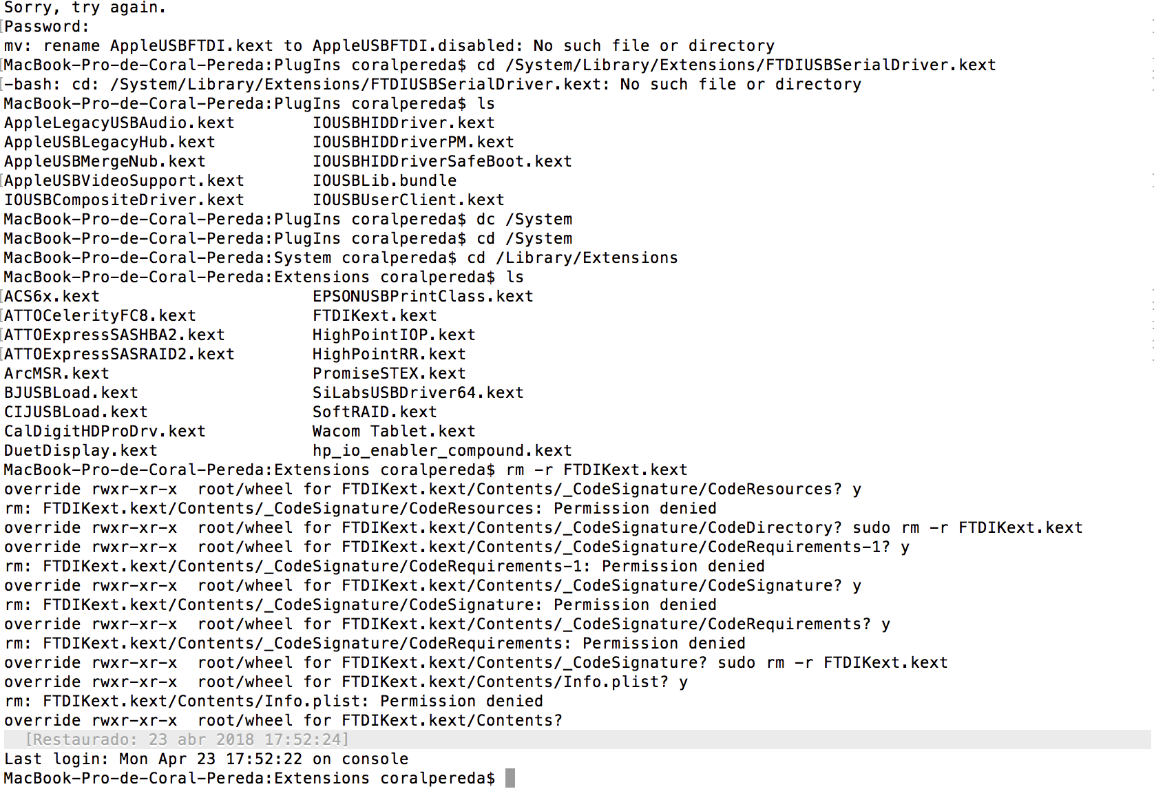 2. Tried to rename the file AppleUSBFTDI.kext while running the computer in root mode.