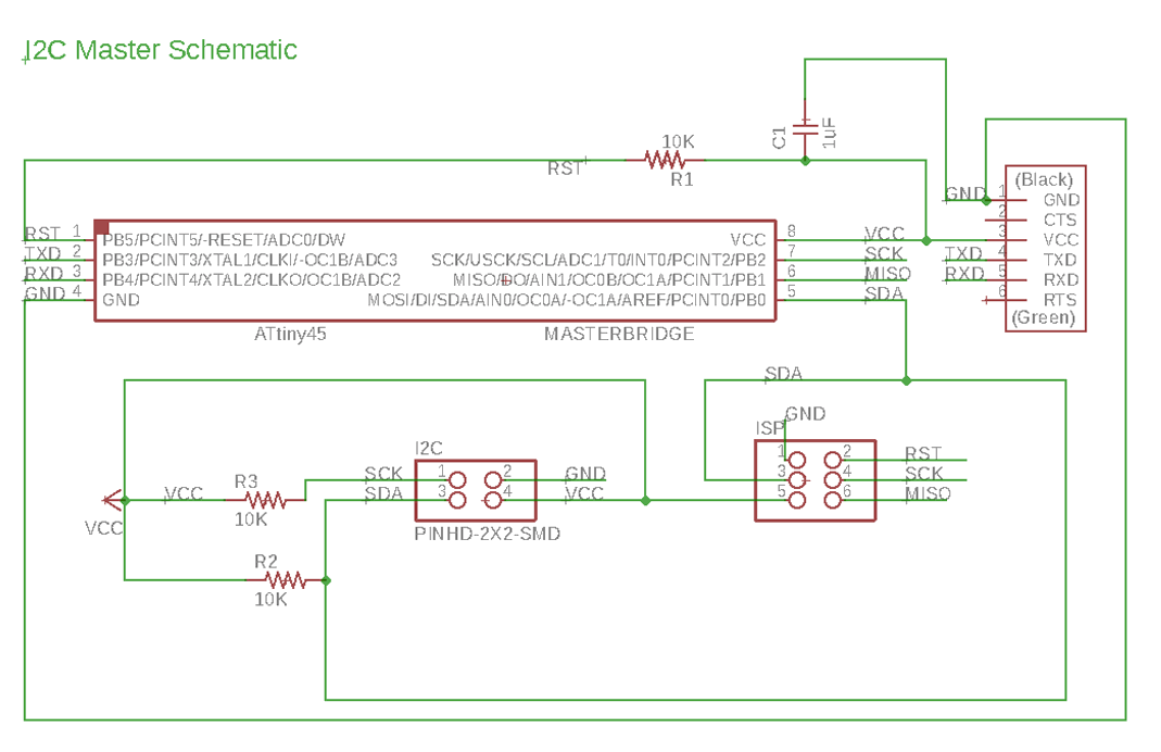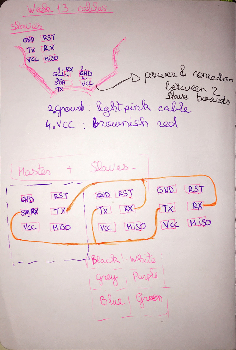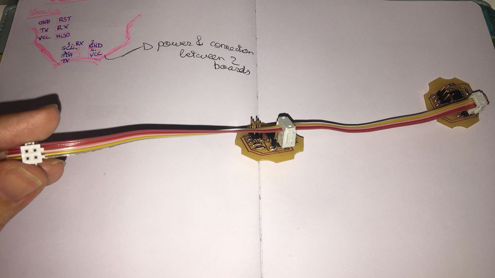 Since I had originally designed my board for I2C Communication, I had written on my Eagle board the SCL and SDA labels. This helped me understand the concept of I2C and how it relates to asynchronous communication. I also used the Serial Software library that I had previously used during Week13: Applications and Interface Programming. I used the pin-out diagram to understand how to wire the boards together and drew a sketch to visualize it better: