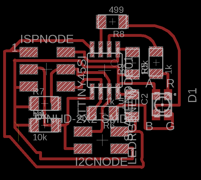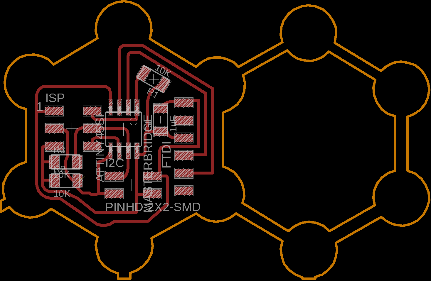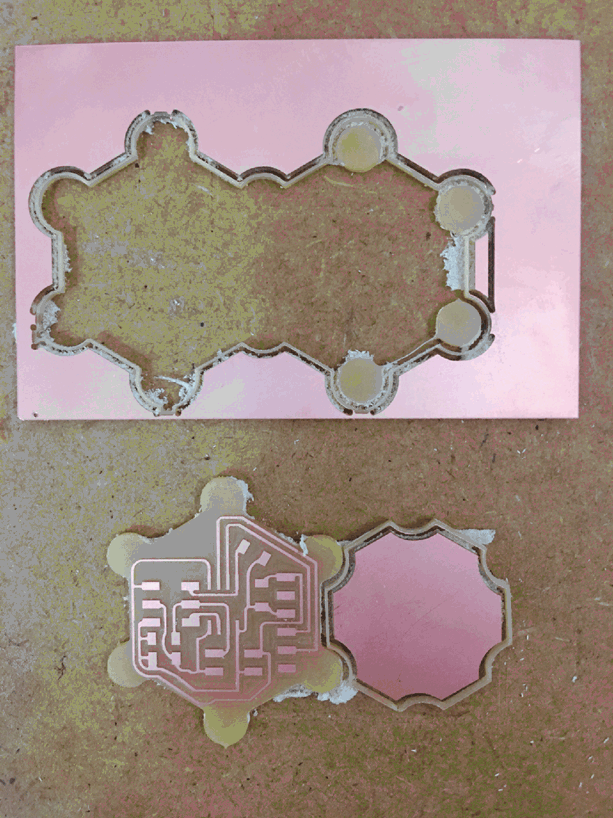 As I was working on the output assignment, I had already had the following issue with the custom board outlines. When I milled the outlines of the master board, I saw that the milling machine had traced a stroke with a cut on each side instead of a single one. It was a shame because the cut-out part ended up being too thin and it broke when I detached it from the sacrificial layer. Not only I was not able to insert the slave boards in the cut-out space but I wasted almost half of a PCB. Thankfully, I was able to see what I had done wrong. When working on the outline Design in photoshop, I should have filled with white the space outside the board. I did that with the slaves and the milled boards turned out fine.