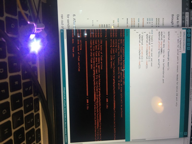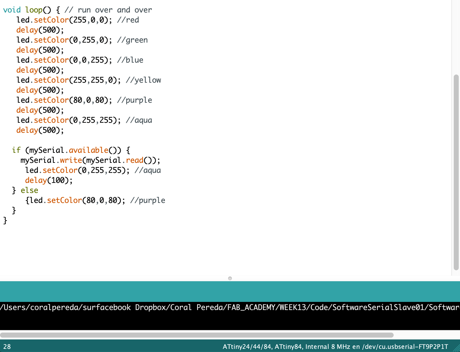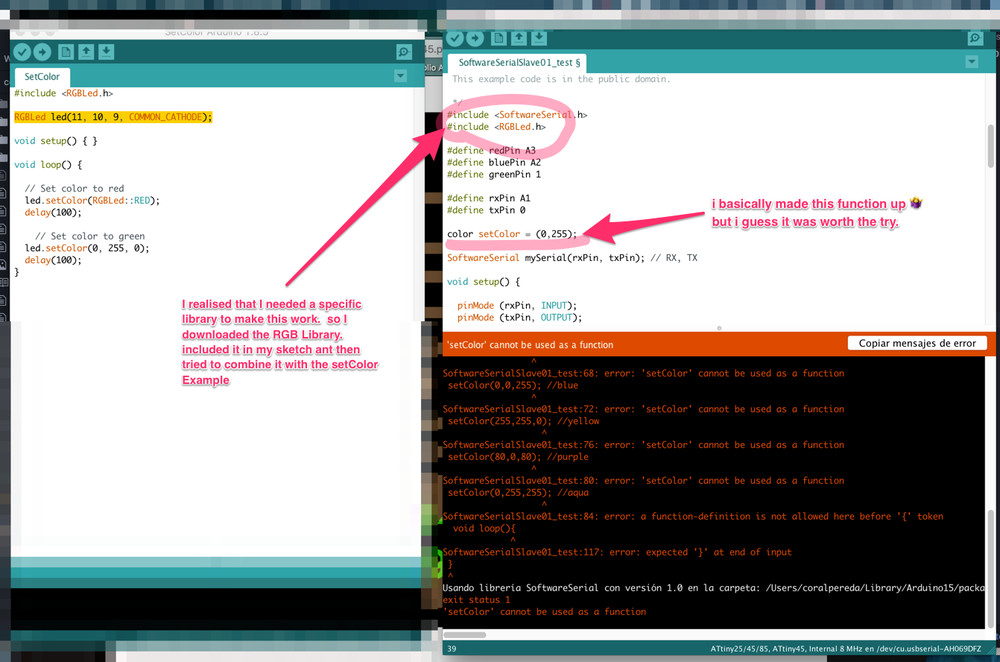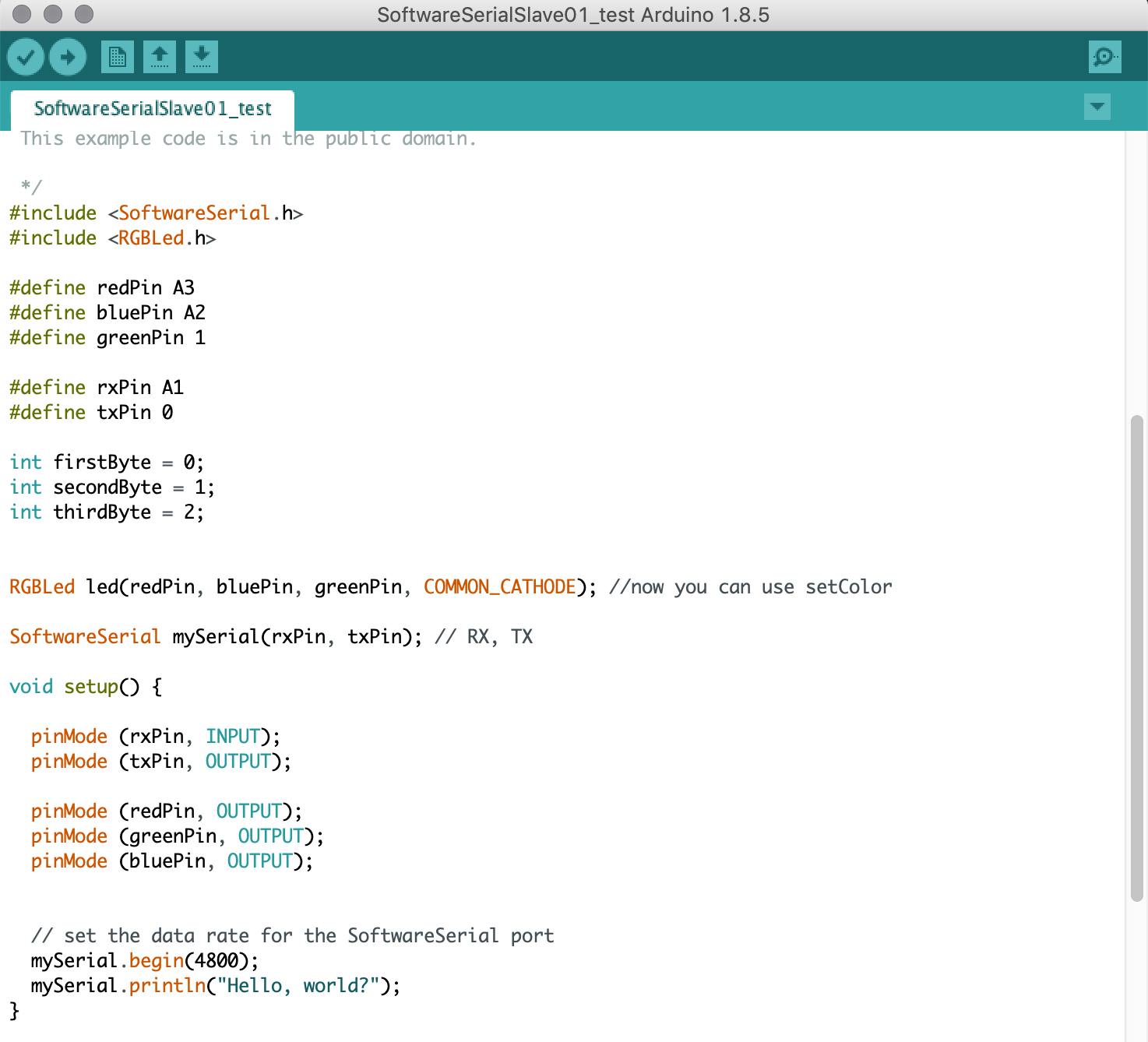 Then based on the RGBLed library example, I combined it with my own code based on the Software Serial arduino example.