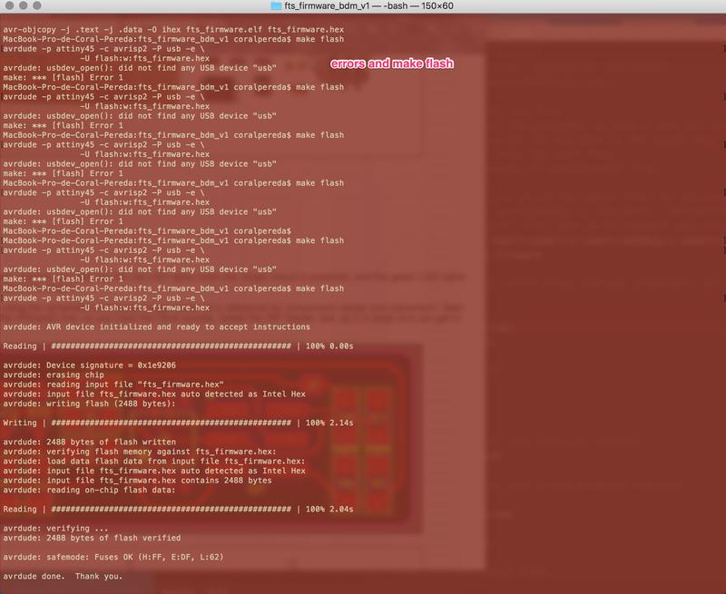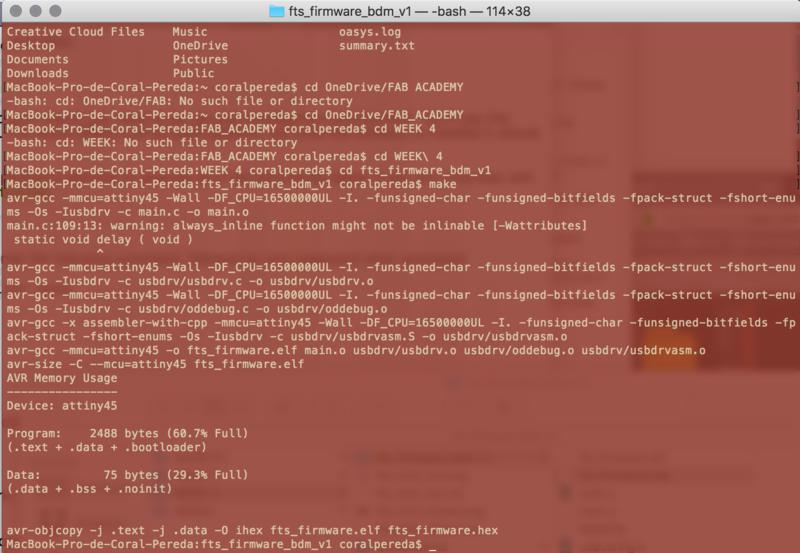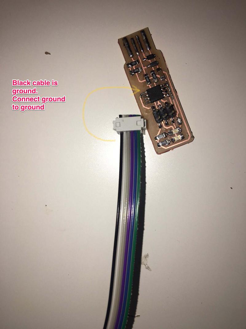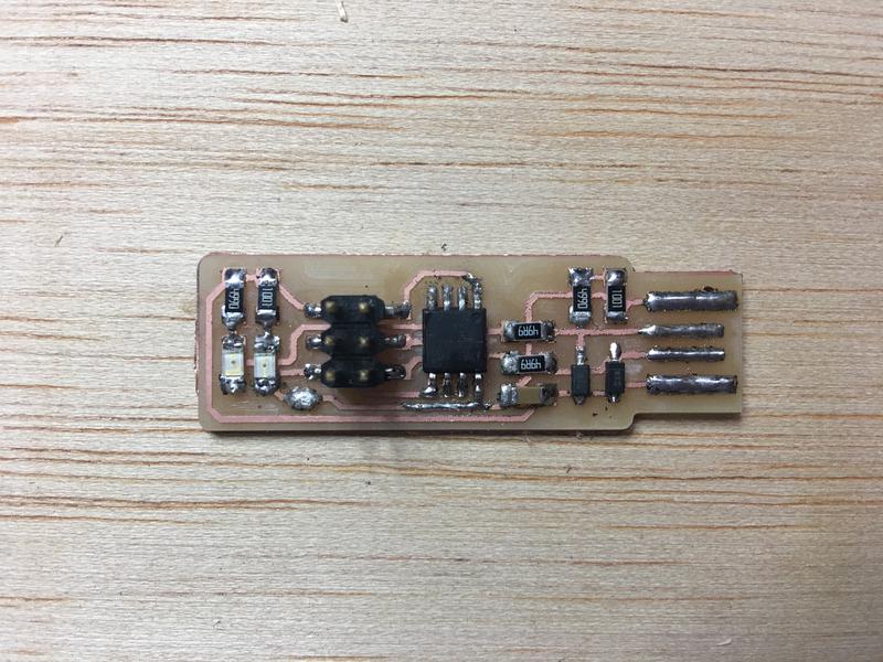 This was successful and I managed to program a couple of other boards using this ISP. However, it then stopped working. This is an issue that also came up with the boards of my fellow students. We think it is a problem with the USB connection. I tried fixed it by adding more solder to the copper stripes corresponding to the USB connector. I also created a base for it with an old debit card and attached it to the bottom of the board with double sided tape. This didn't work either. I would recommend for people to make a different FabISP and not the USBTiny because of the recent errors.