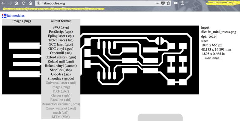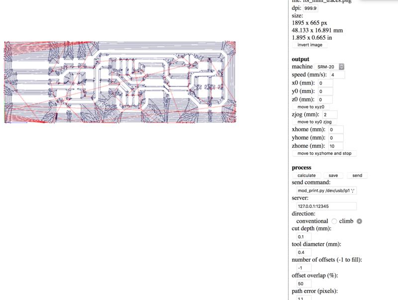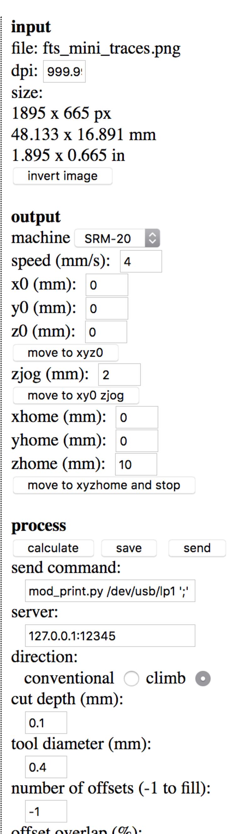 When you mill a circuit design, you start with a monochrome .png file: either one you have yourself created or one you have been given. In my case, and as mentioned above, I parted from Brian's .png design which can be found here. However, the SRM-20 cannot directly read a .png and the latter needs to be converted into G-code. This format is used by numerous digital fabrication machines such as milling machines or 3D printers. This code takes the shape of a text file containing the x,y and z coordinates of each point along the main paths of the .png design. In order to generate this code, I used the online tool developed by Neil Gershenfeld called Fab Modules. Below are a couple of screenshots showing the settings I used for generating my first G-code:
