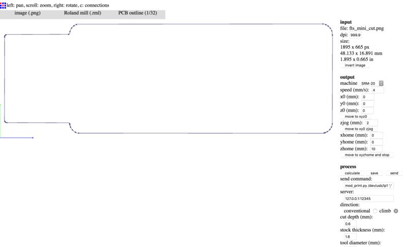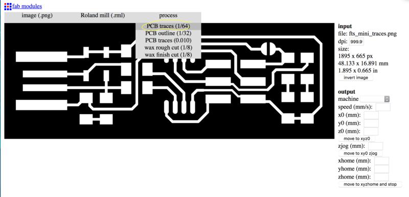 You need to run this process twice since you need two different G-codes: one for the traces and one for the outline. First go to the top-left tab labelled "image (.png)" to upload your .png file. Then, on the tab next to it select the output format as "Roland Mill (.rml)" and then go for the "PCB traces (1/64)" first.