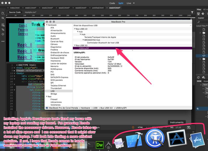 Programming boards has always been a bit of an issue for my laptop. This is mostly due to the fact that my USB ports have trouble locating the boards. In this case, the USBtinyISP wouldn't show up under the hardware section of my Mac's system report. However, as seen below, it did show up on my friend Daniel's laptop which led me to think that it was a driver problem: