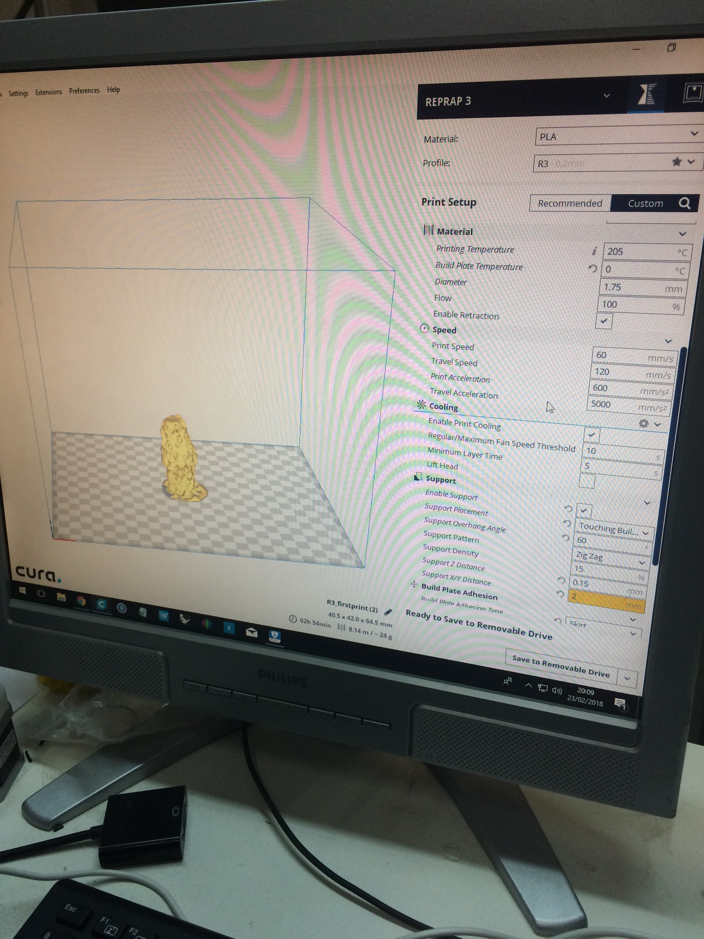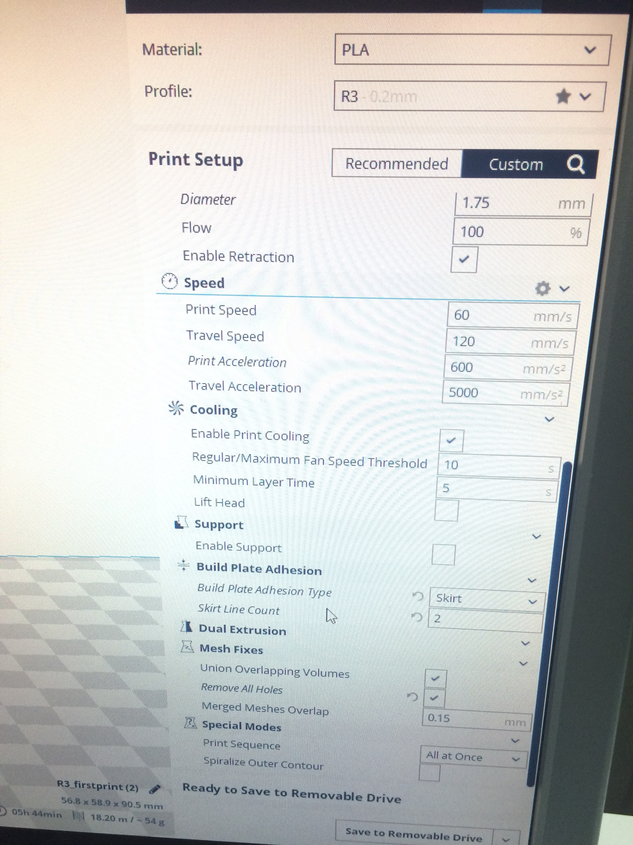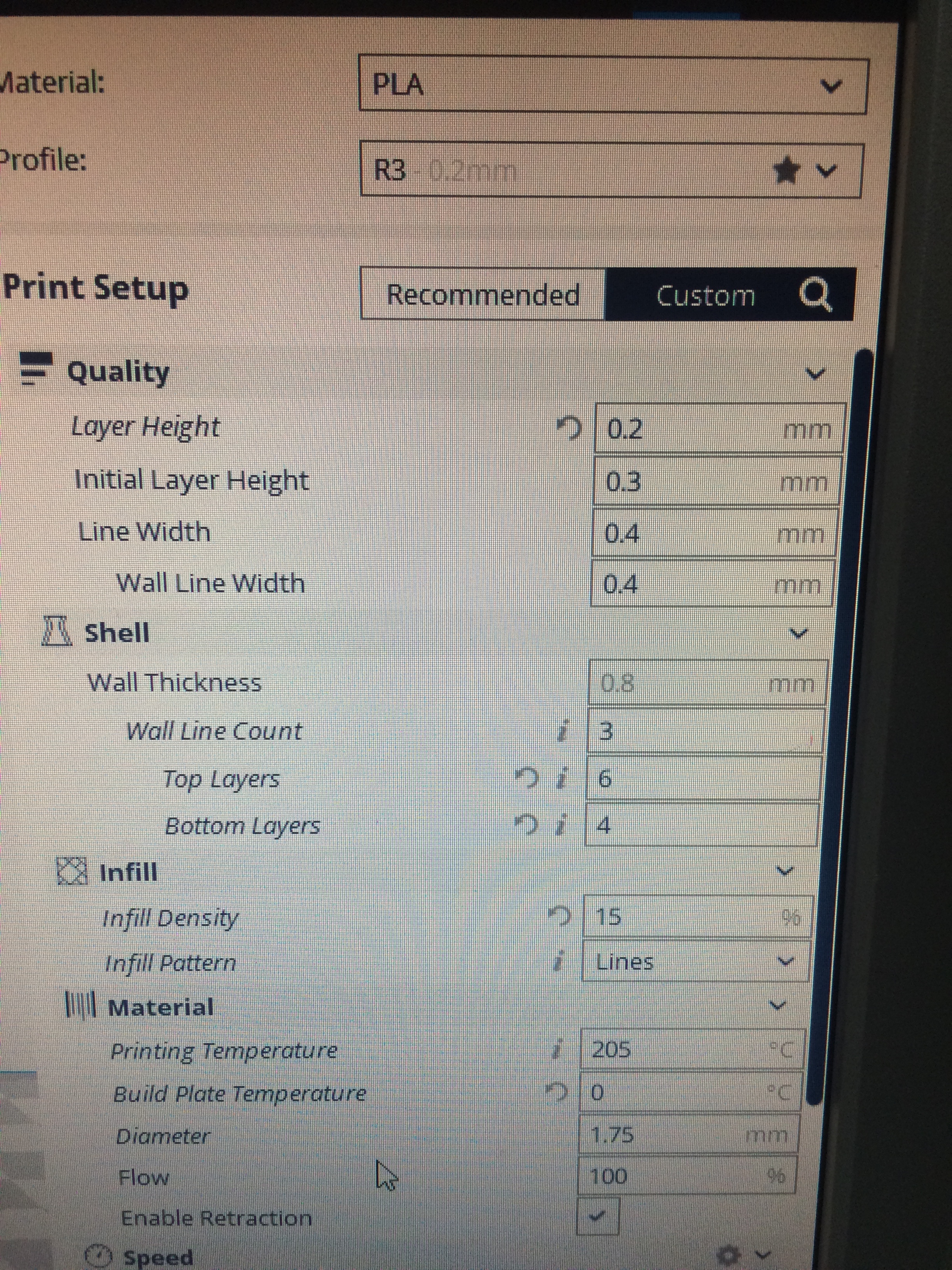 Our group test cut was successful in the sense that it helped us find the optimal cutting and engraving power, speed and rate (see below) for cardboard. Ideally, it would have been nice to try out different materials, but we did not get round to this. Importantly, it also showed us how to manage the rather complex workflow on the Fablabs lasercutters, and we worked out both the kerf on a material as well as the optimal width for a press-fit join.