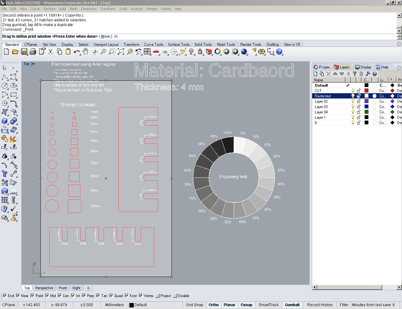 Seeing we were going to be doing our pressfit in cardboard, we decided to test the power, speed and rate of our Trotec as well as check the kerf dimensions for a pressfit design. First we downloaded a lasercutting material template from Thingyverse. This is a simple way of showcasing difference of between raster and vector images, using 20 different engraving shades, precision using different font sizes as well as square and circular shapes. In Rhino I also designed a pressfit test cut.