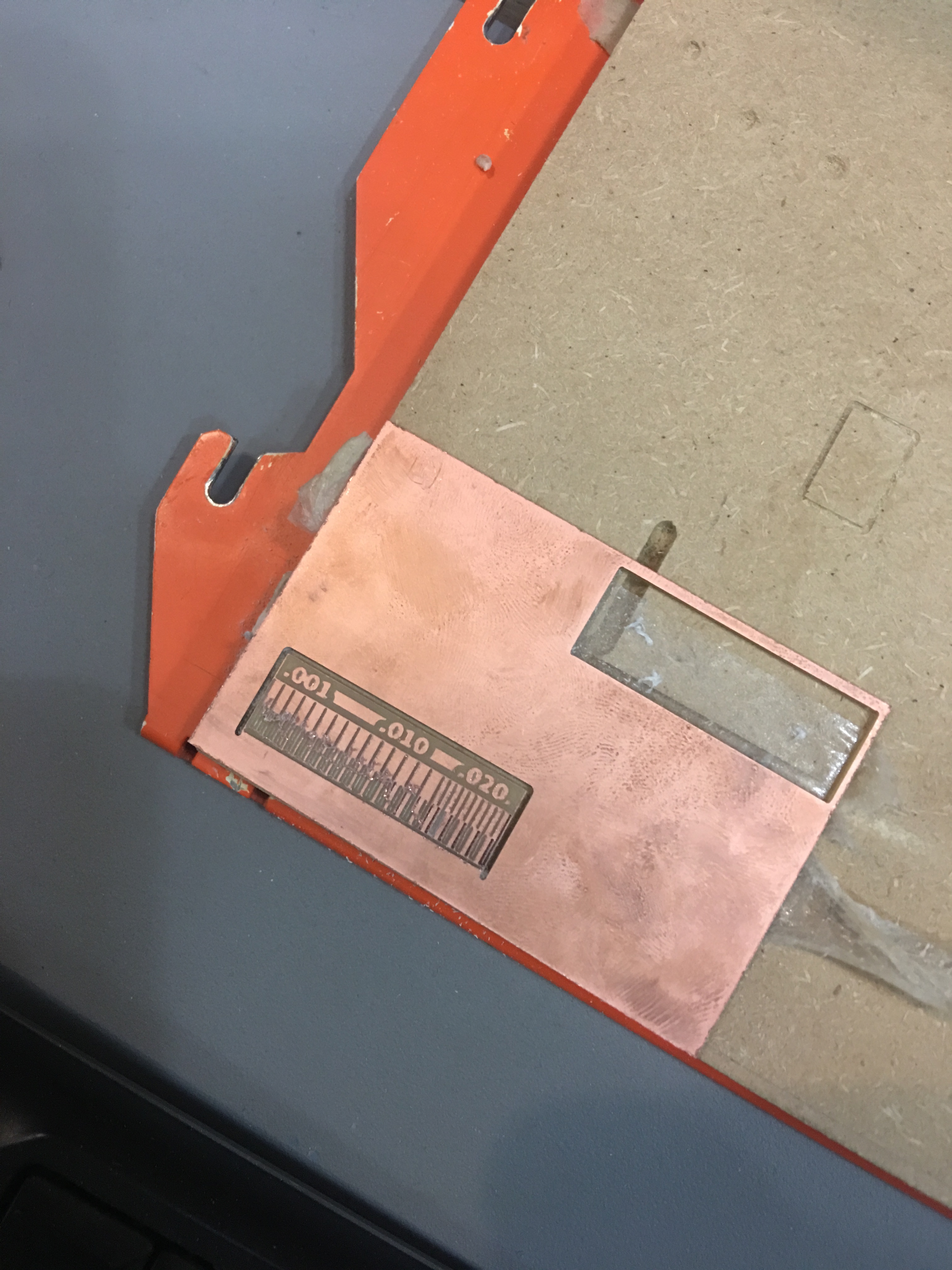 This completely burnt through the darker shades of our raster, but it gave a very complete view of the different effects. In fact the pattern left by the burnt-through darker shades reminded us a little bit like the patters moths leave when they chew your clothes. The low cut however, engraved the text nicely.
