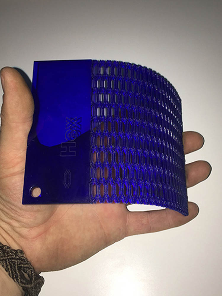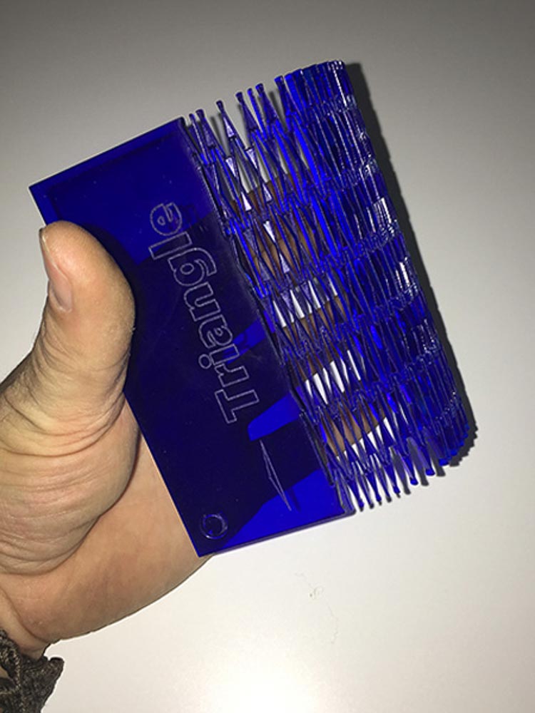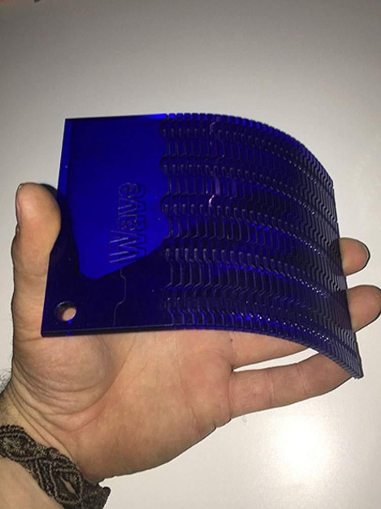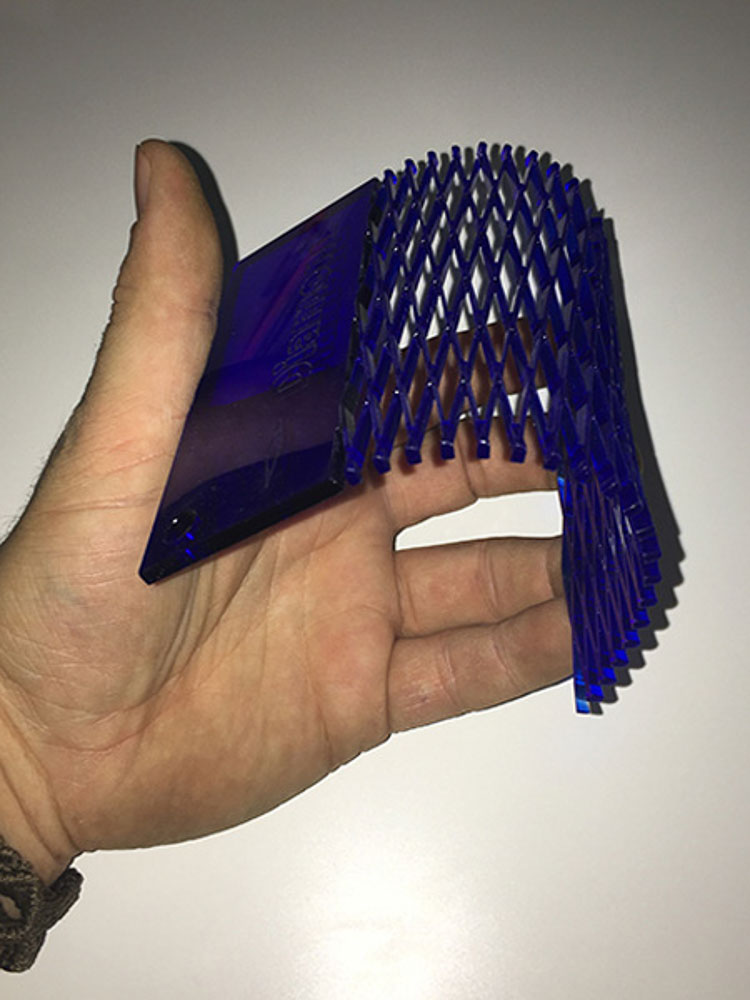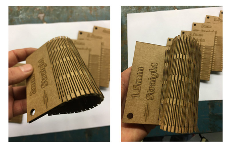 I am also experimented using differing materials like Card, Wood and Acrylic. Obviously there are a lot of variables which can directly affect the outcome and properties of the flex. Material choice, thickness, pattern type, orientation and material grain, the separation between the cuts, and the width of the cut and the laser-kerf itself, all play a part that will affect the play, direction and amount of achievable bend.