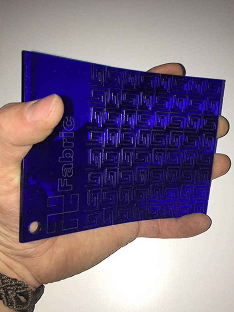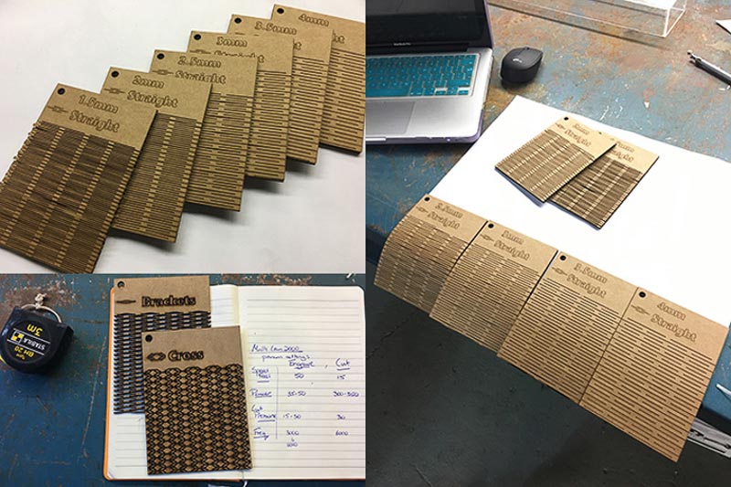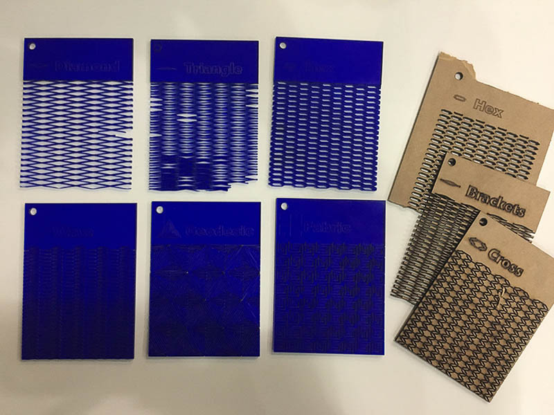 ObraryThen I played with these files and got to work making test patterns. I was learning much about settings and use of the large open bed MultiCam laser. I eventually ended up with some nice test pieces of live hinges in card, demonstrating the differing flextures of altering spacings between the cuts or having different repeated pattern elements.
