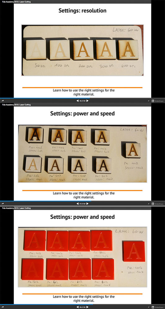 I considered that it would be nice maybe as a future fab-project one could create a wall sample for common materials and their appropriate settings for each of the laser cutters to compliment our fab documents, but this would take some time and would be a lot of repetetive work.