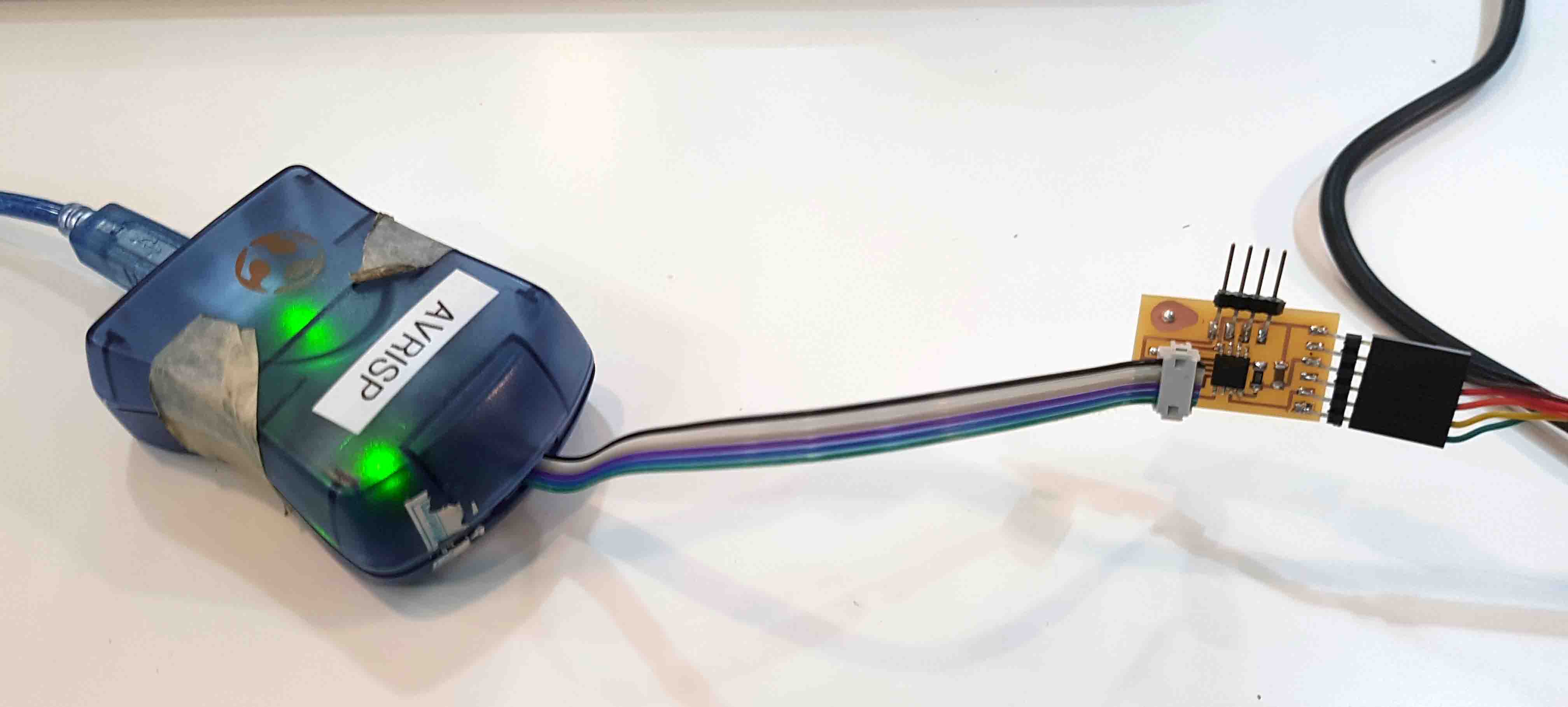 Time to program the board. We connect the AVRISP2 programmer and the FTDI cable both to the board and the computer.