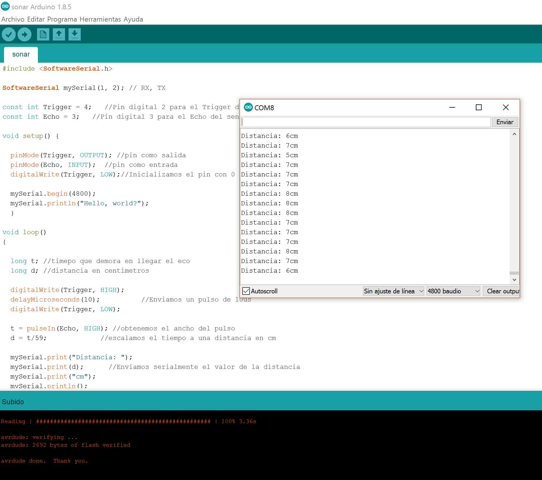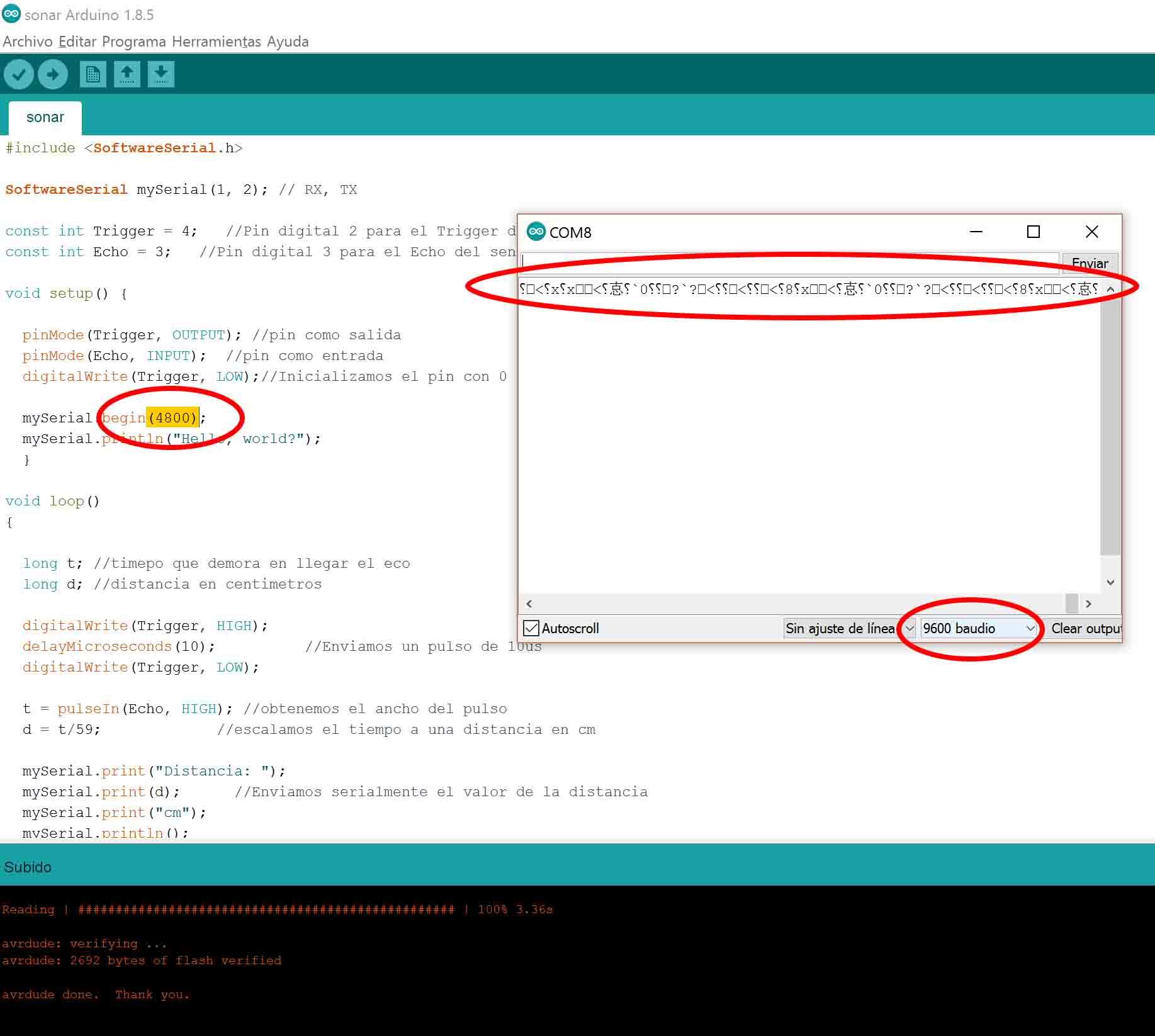 And now we can compile and upload. Now if we open the monitor we will see what the board is feeling through the sonar. Weird characters appear. That is because the baudios in the code do not correspond to te baudios in the monitor: