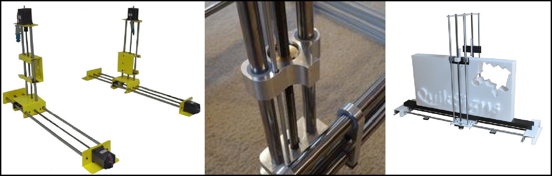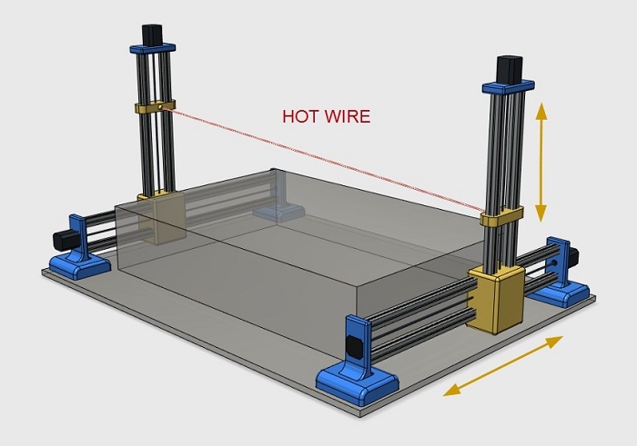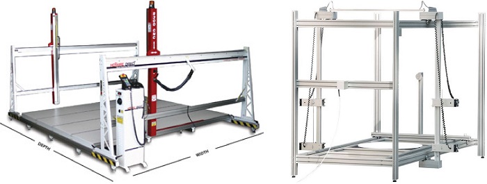 Some machines use the steel rods guides as a structure. In my opinon it limits the high of the Z axis towers, The rods can flex due to the weight of the Y axis or the tension of the hot wire. Other machines use extruded aluminium profiles systems like macaduino wich has a lot of accesories and offers an excellent precission but is an expensive system The more simplest systems uses Drawer Slide for the Y axis.