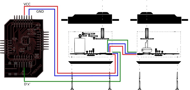 Another important design solution has been the system to maintain the tension of the hot wire. In addition to using a tension spring, a servo motor is used to wind or unwind the hot wire spool and another servo to define the correct position of the tensioning arm. To the first servo we remove the potentiometer so that it only works as a motor without feedback and the other servo we remove the engine so that its only function is to send a feddback. Besides the servos we will need a controller board. Fabduino