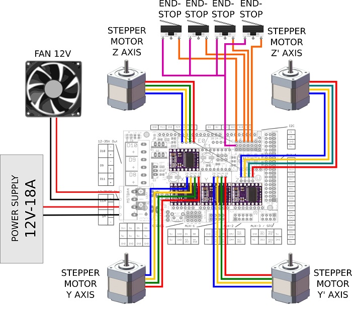The 4 axix machine movement system will take care of the operation of the stepper motors, end-stop sensors input and manage the information received by the gcode sender.