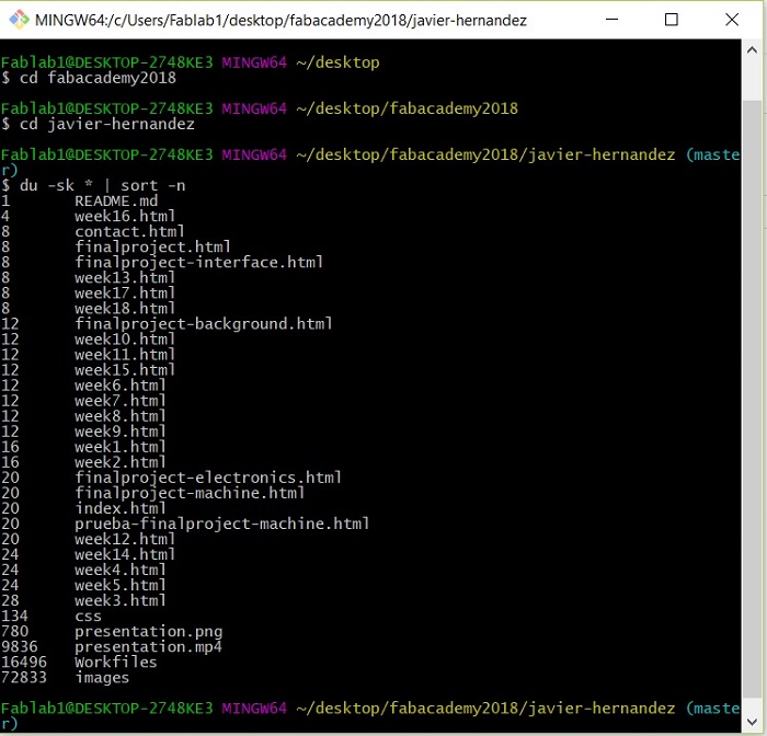 Another nice way to control the size of the files is to list them, in this case we can use Gitbash with this command line du -sk * | sort -n