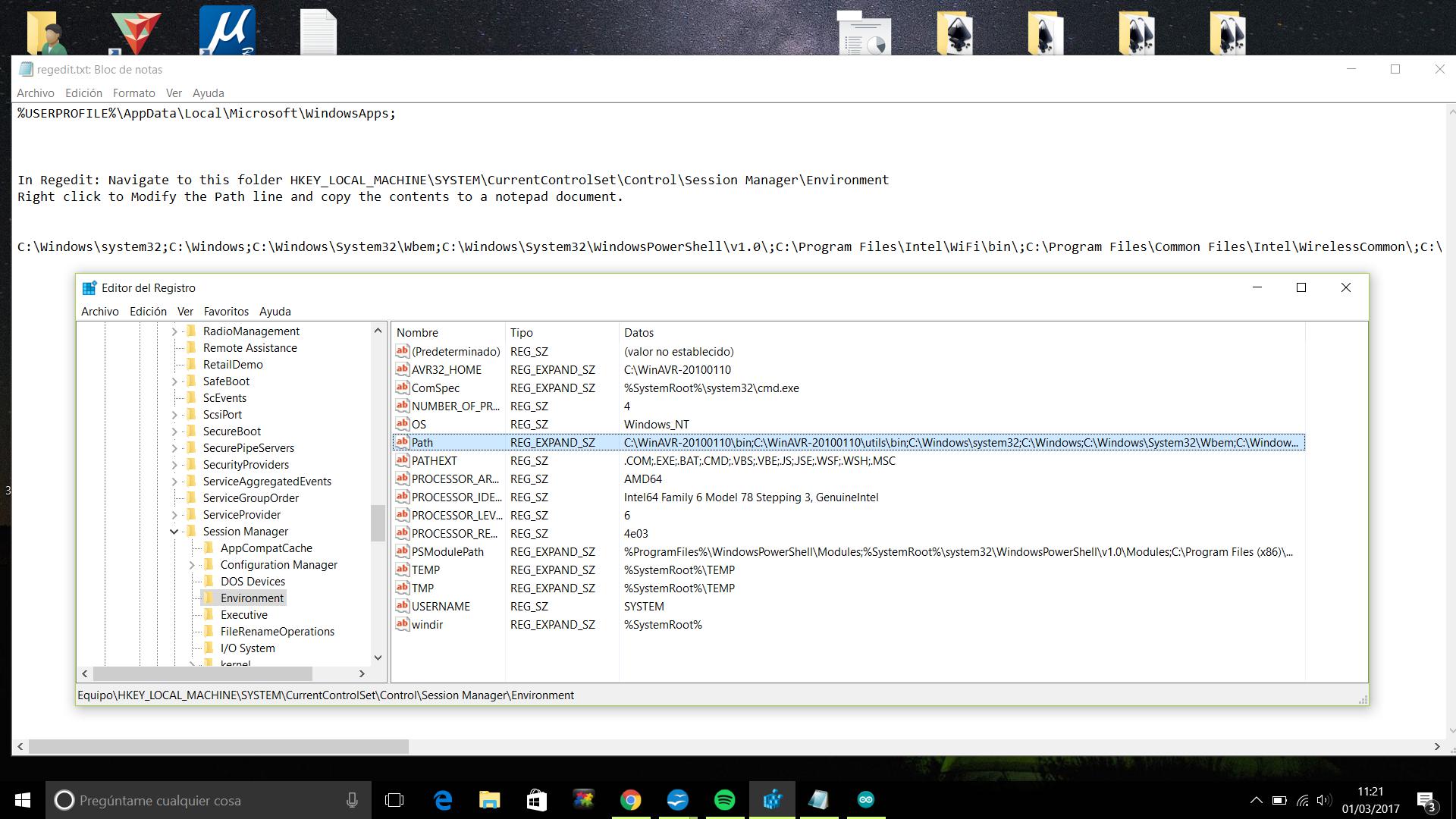 I made a backup of the Path enviroment, it seems the AVRdude installer sometimes overwrites instead of updating it. We can do it using “ Windows key + "Regedit” clicking right button to modify and coping the path line.