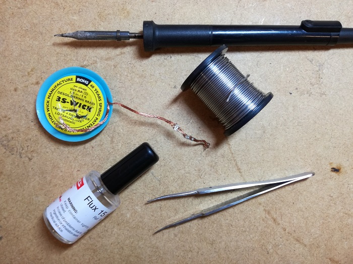 Soldering iron, Tweezers, wire for soldering, soldering remover and Flux. All we need to start soldering!