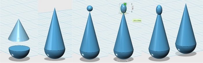 Place half sphere and a cone with the same radius, scale the cone and put it on the half sphere, place a small sphere on the top of the cone, scale de sphere in the z axis and move it down, Make a copy of the half cilinder and the cone (we will use it later)