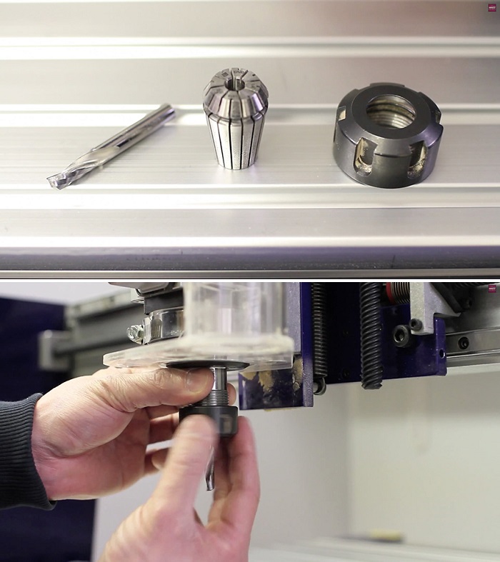 Now we can move the bridge and the router close to the border in order to change the milling tool. Be carefuul the tools are very sharp