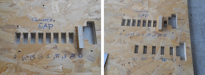If we use joints in a design to cut with a CNC machine it is necessary to bear in mind that not all materials respond equally, we also have to look for a balance between an easy fit and a narrow one. For this it is necessary to make fit tests and evaluate, in this last point it will be the experience that guides us to decide the right "Clearance" (space between male a female part of of joint)