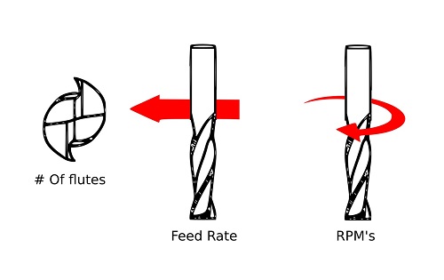 Where chipload is the amount of material cut per tooth (feed per tooth). Feed rate is the surface speed of the cutting tool in inches per min, spindle speed is the rotational speed of the cutting tool in revolutions per min, number of flutes and cutter diameter are determined by your tool.