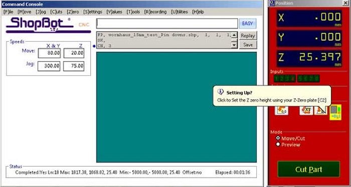 This is what we see when we open the shopbot software.This machine has proximity switches, setting the x/y 0 is easy. there's a command called "set the x/y 0 with proximity switches". it's good to use the machine 0, if a job is interrupted for whatever reason it's possible to restart it without loosing the precision.