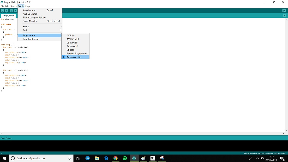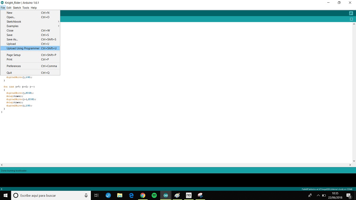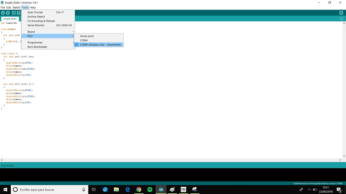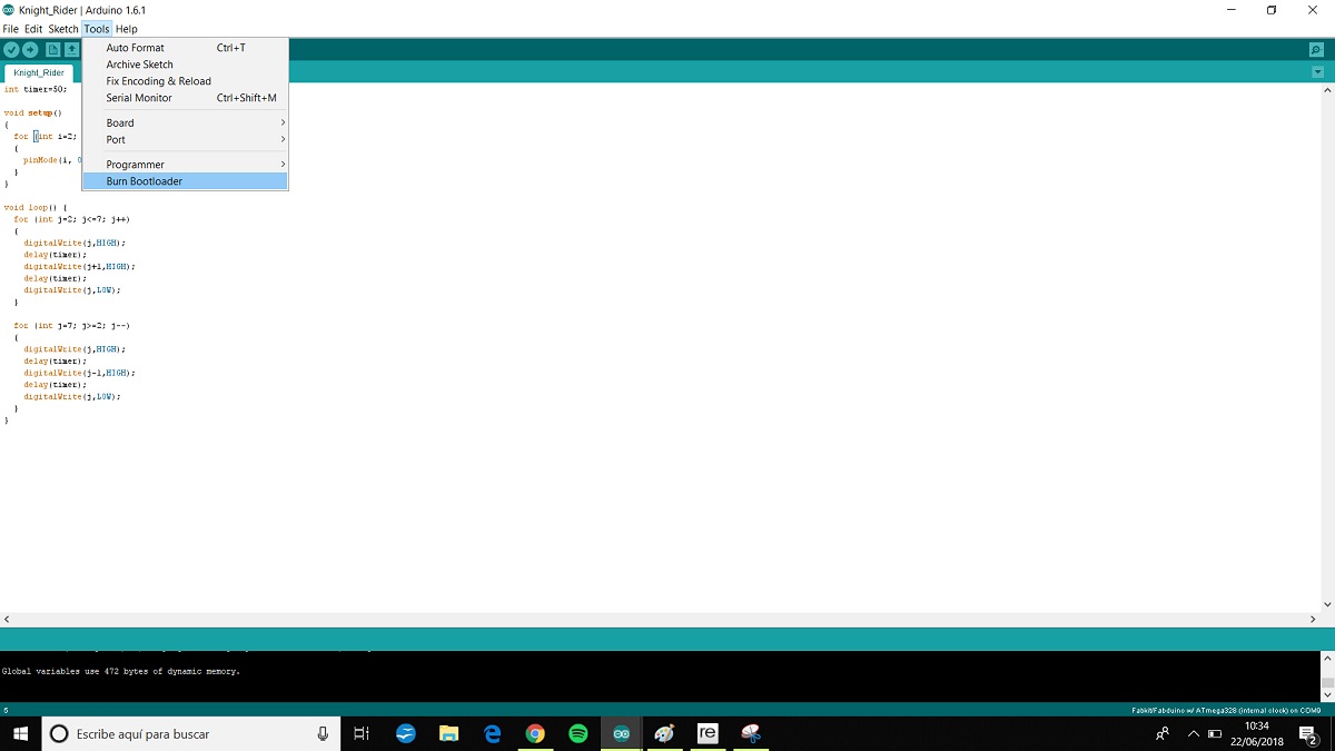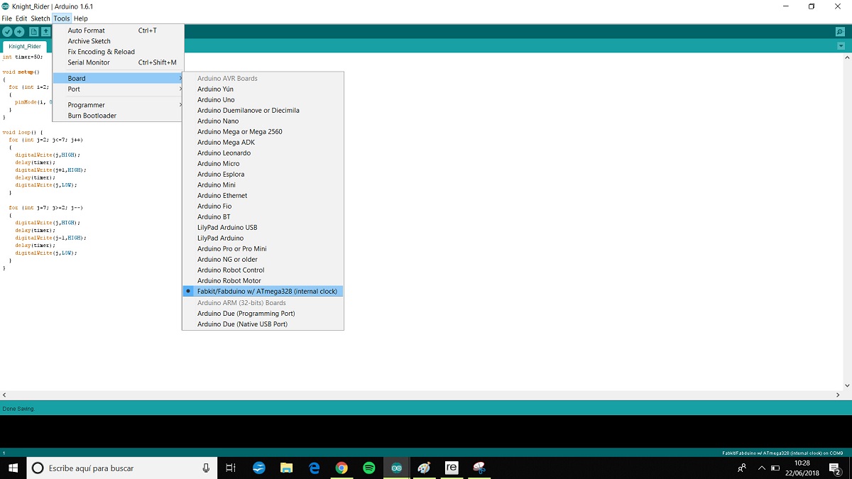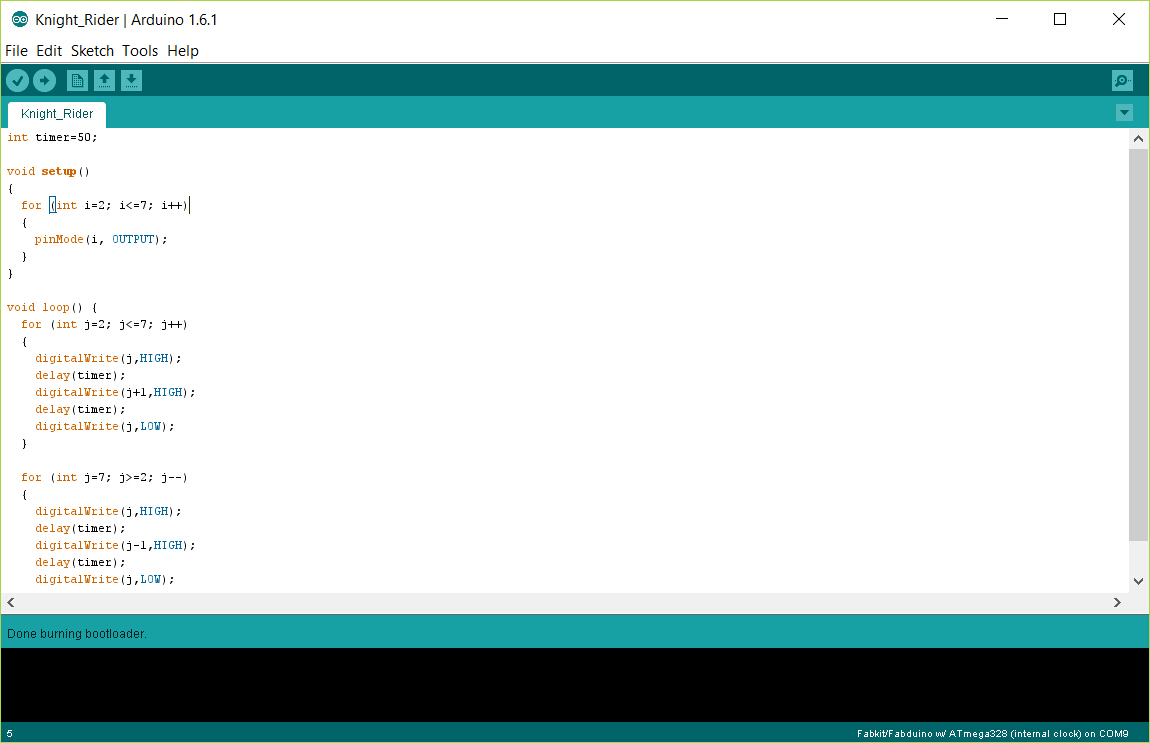 I made a Fabduino board for the input assignment and i want to try the knight rider program