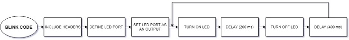 The while (1) instructions creates an infinite loop, where we will be able to turn on and turn off our LED. In order to achieve this aim, we use the PORTA register to control the voltage levels for each pin ( 0-->0V 1-->5V). As well as we have done with the DDRA register, we apply an OR operation between PORTA and a 1 rotated as positions to the left as the used port number (1000 0000) to set its pertinent bit to 1 in the PORTA register and turn on our LED. But if we want to turn it off, we need to set the bit corresponding to our port to 0. For this reason, we rotate a 1 so many positions to the left as the number of the used port (1000 0000), we complement it (0111 1111) and we apply an AND operation between this byte and the PORTA register. As we can see, between turning on and turning off our LED we need some delays to be able to appreciate this changes.