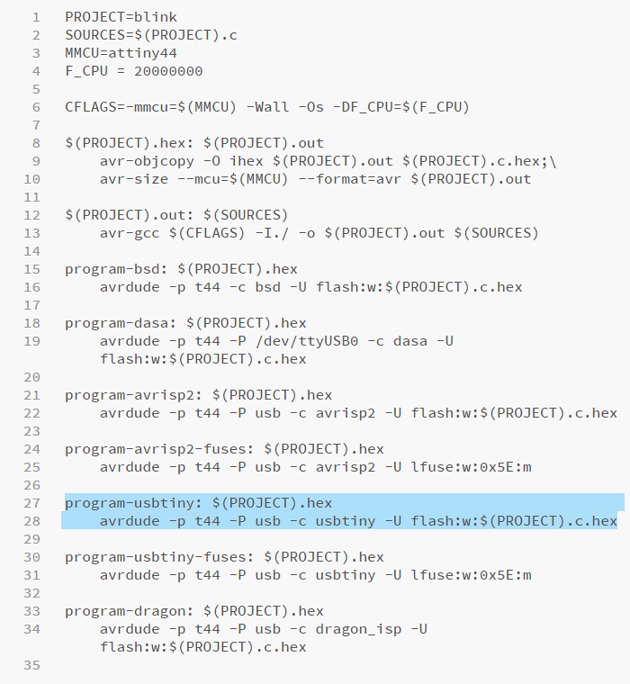 In the first four lines we can see the Name of the file to compile: blink; the Extension of the file to compile: .c ; the Microcontroller to program: attiny44; and Frequency of the board to program: 20000000