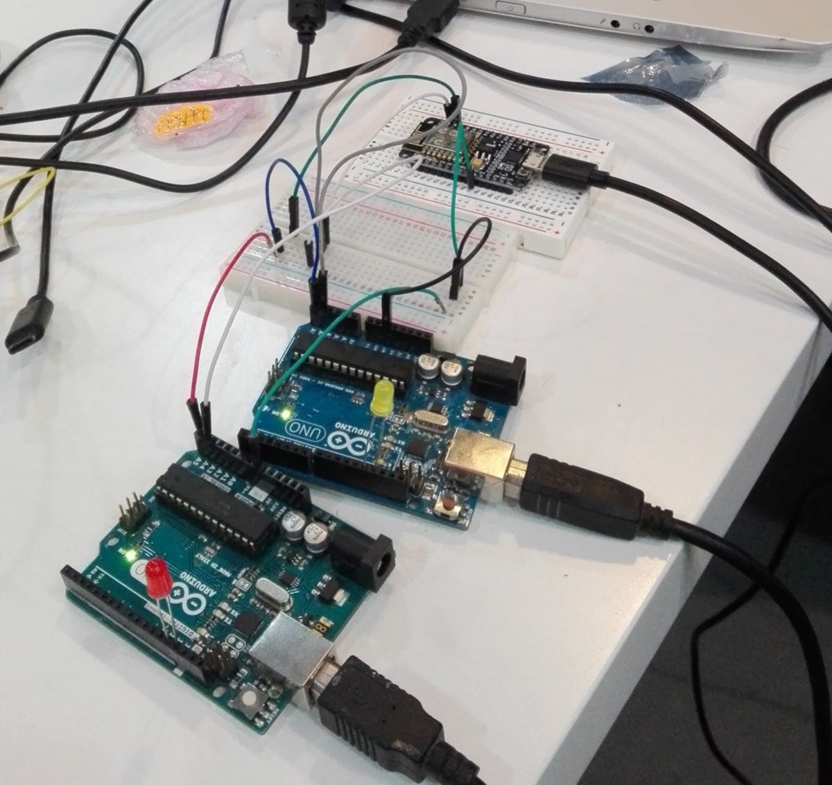 I have yet to upload the sketch for slave #4 (microcontroller on the left-hand side). However the setup works, I added an extra arduino as a slave to prove the point that I2C allows connexion between many devices at once.