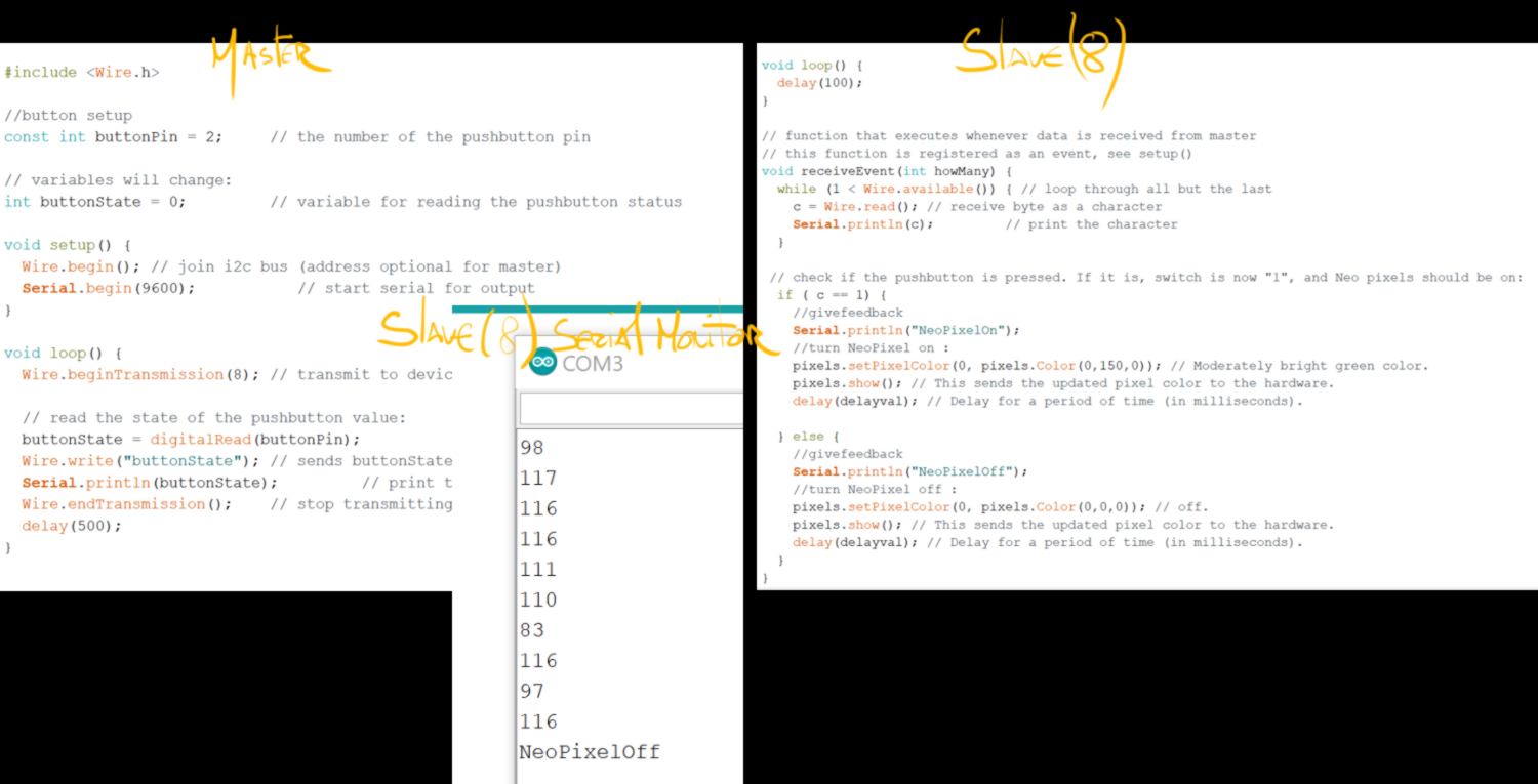 To test my code, I need at least one side (either Master or Slave) that is functional. I revert back to the original I2C tutorial. I can easily verify what my Master sends through the slave serial, so I add the part of my code related to the button and use the variable generated as data sent through the I2C. I works. I then add my if statement to the slave code, triggering the NeoPixel to be switched on if the slave "reads" a specific value (here"1). It works: