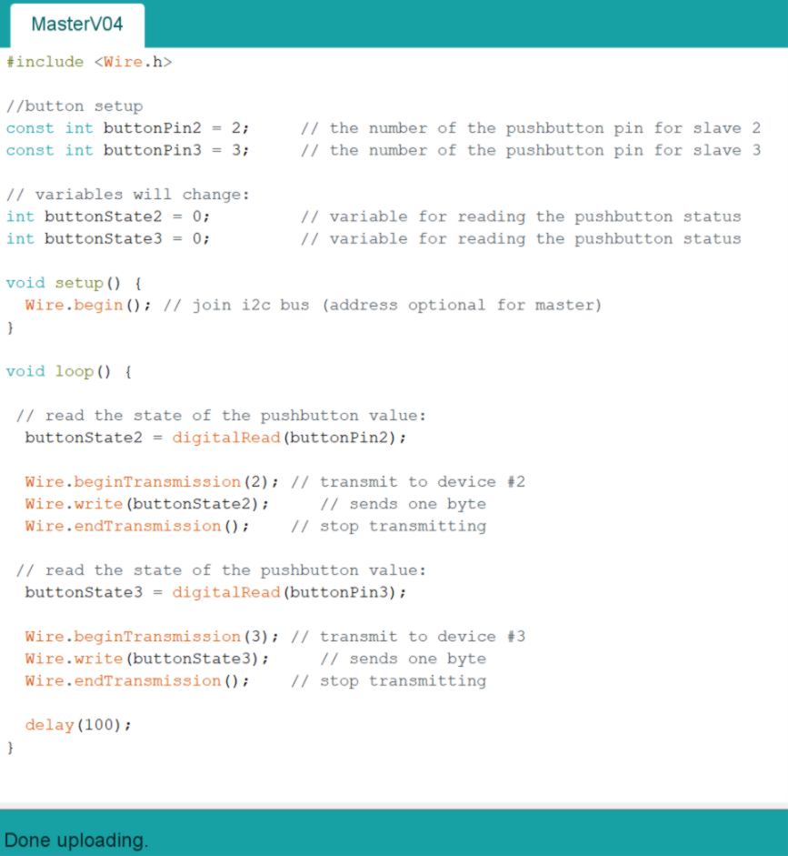 The next step is to add an extra microcontroller to the setup. I first need to modify my master code so it sends input to another microcontroller using another button, and duplicate my slave code :
