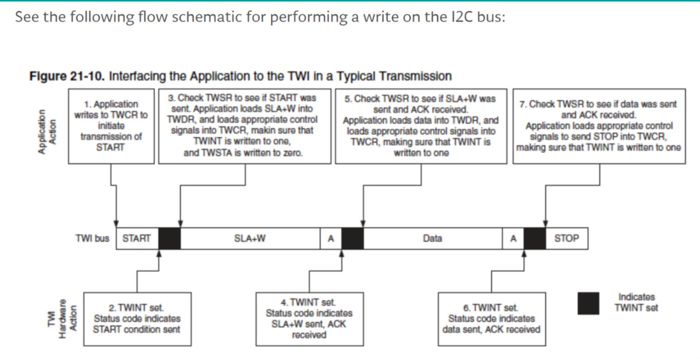 My last read is the Wire library detailed reference, which : " attempts to {...} give the Wire library the documentation it needs and deserves." I learn that on the ATmega, there is a specific piece of hardware, the TWI, that will handle the communication. Some of the documentation is still a bit cryptic but knowing what the general concept is (see diagram below) I get an understanding of how the TWI reacts to the call of different variables.