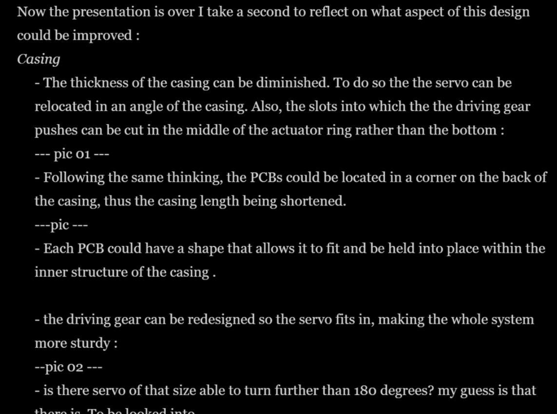 Everything works to a functionnal extent, therefore I could leave this section blank. However there are still many aspect of the design that would benefit from further improvements. The list is long and detailed, and can be found at the very bottom of the final project page.