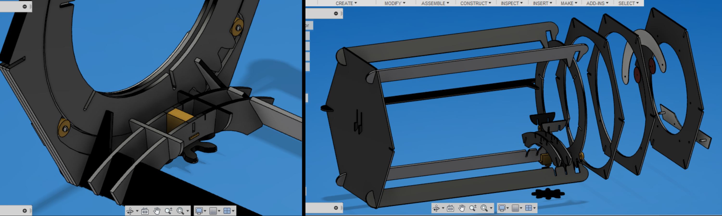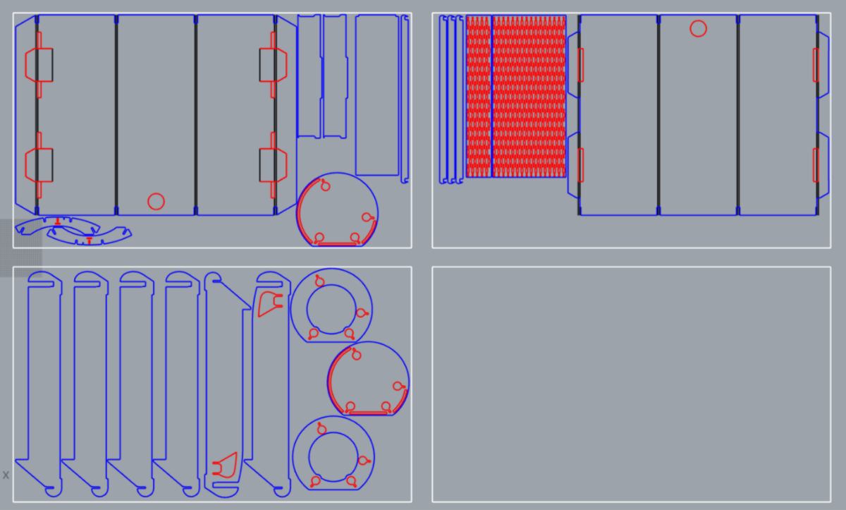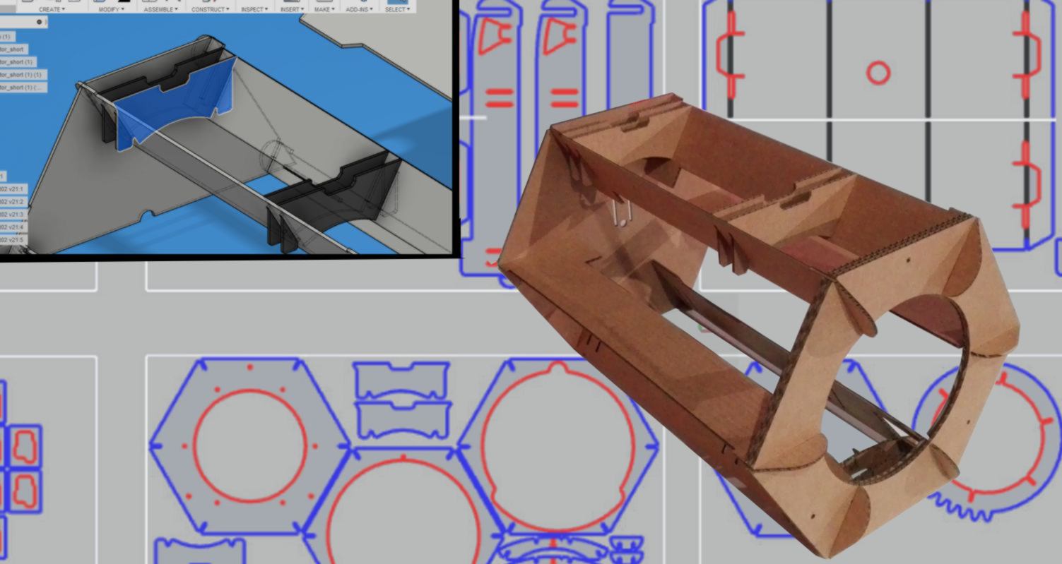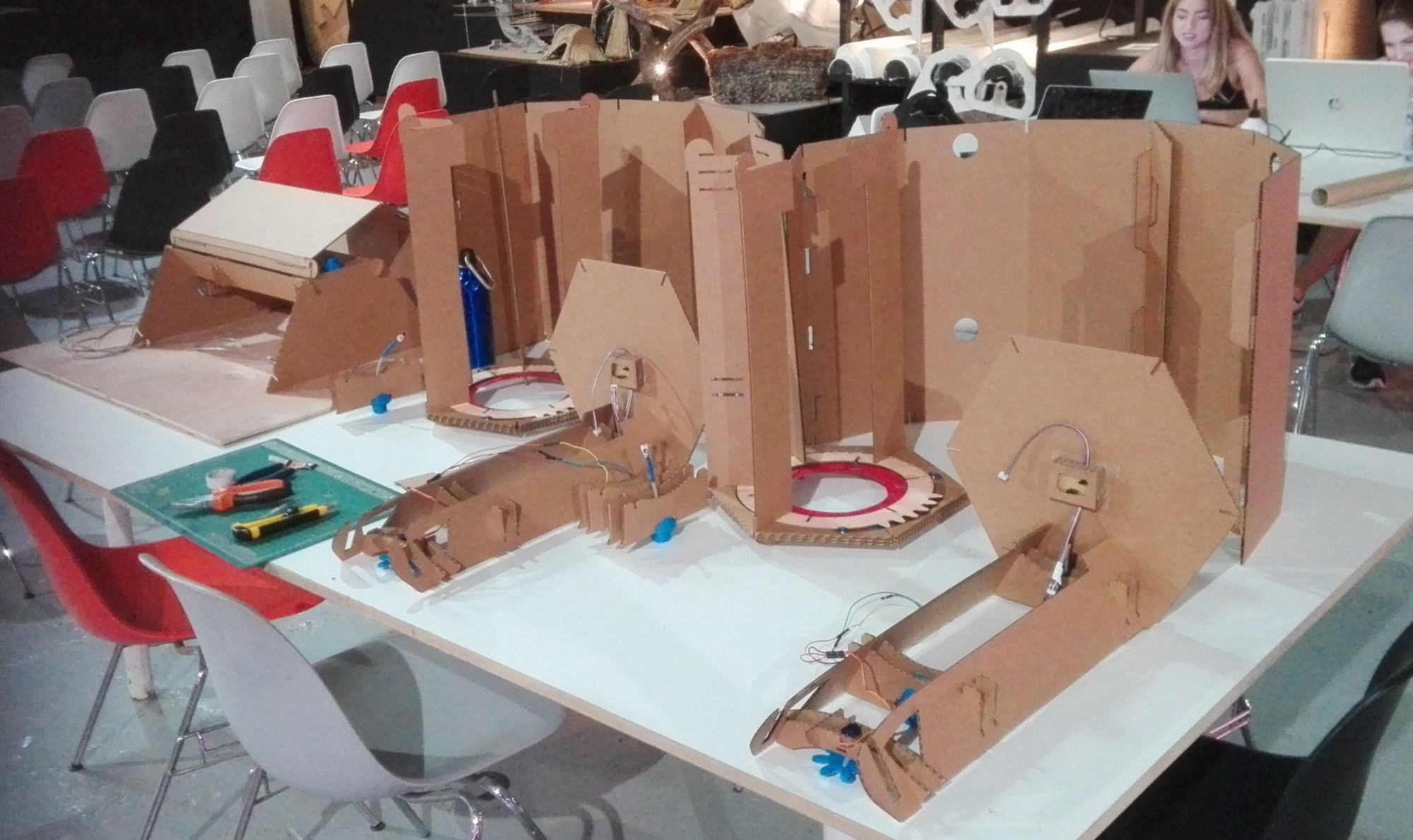 Two techniques were used : laser cutting (structure, shell) and 3D printing (connectors). All elements were designed in Fusion360 and Rhino: