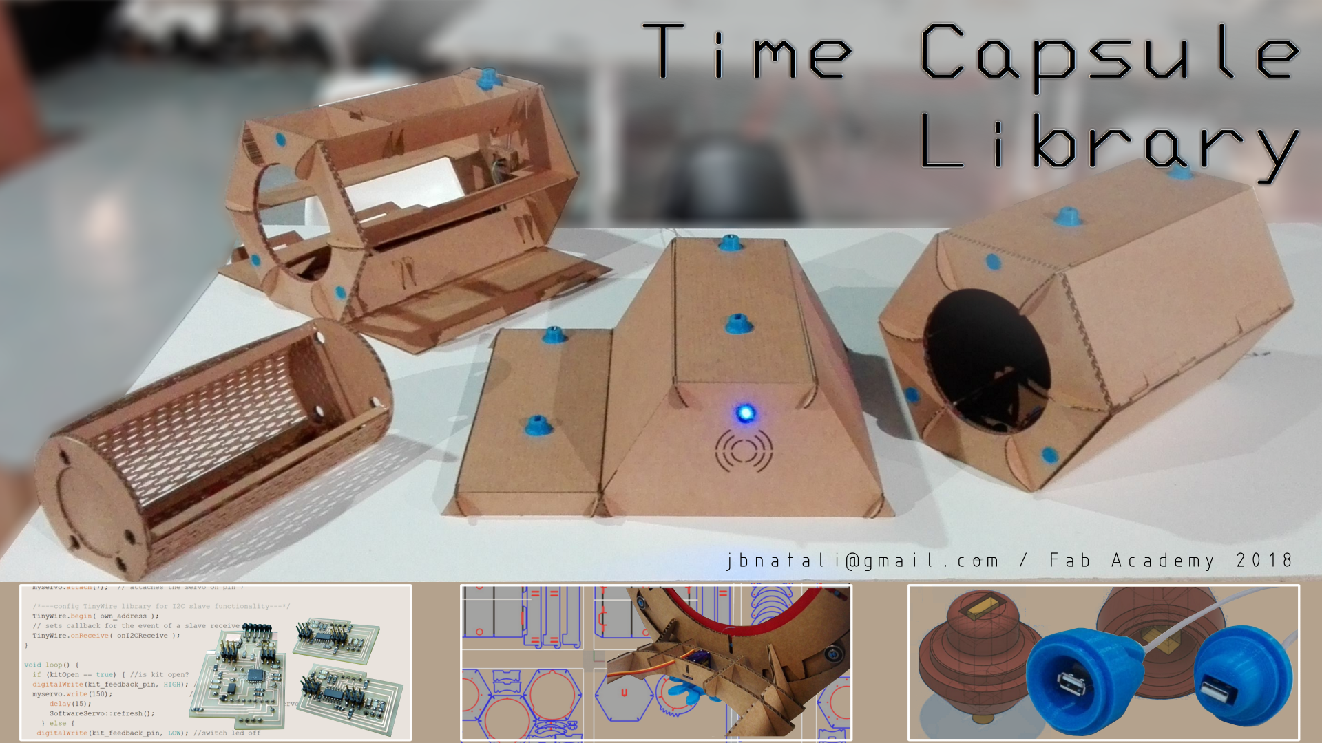 The RFID tags are read by a RC522 reader. An ATMEGA328P storing the valid IUDs grants or refuses access to time-capsule casings and provide an immediate visual feedback. If valid, a signal is send though an I2C network to all corresponding kits, enabling the opening of an iris via rotation of a servo. Once the user has taken time-capsules off the shelves, casing can be locked back by swiping the RFID card.