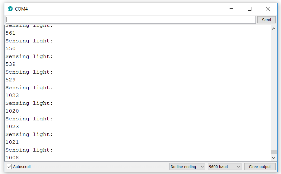 Programmed the board, then hooked it up to my FTDI cable and to the sensor, selected the right Port, and opened up the Serial console to see my inputs: