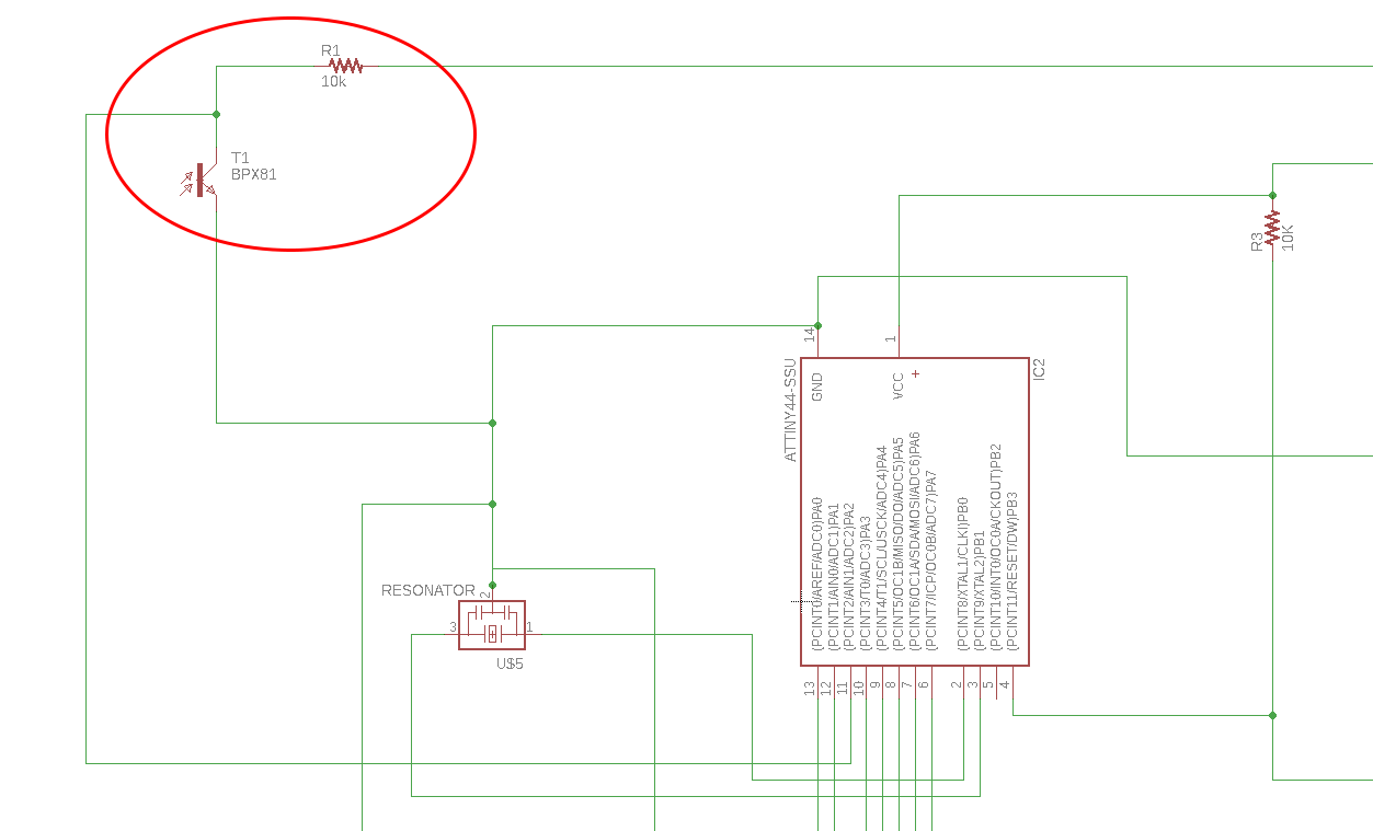 On my already existing hello world board I'll need to add another connection to the PA2 pin and to the VCC coming out of the 6pin connector (either of them, because they both converge anyway), as well as another connection to my resonator's output as it's on it's way to GND.