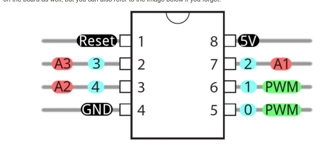 In blue the pins that correspond to the pins of the Attiny45
