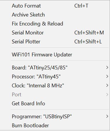 the Arduino programming software settings in tools for the attiny45 input board.