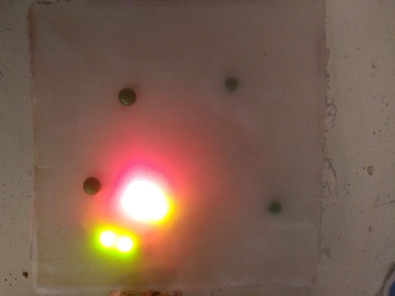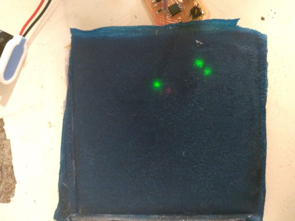 I've tested two coupons with white and blue cotton for a composite. But then I figured I would like felt as a material, just because it is beautifull. But the LED's need to really shine through later on. So i tested that. I put my node board on a 9V battery. This has 4 LEDs in series, so each recieves 2,25V. This is what it will probably be in my final project where I will connect 4 rows of 10-parallel-LEDS strings in series on 9V. Under all three fabrics the LEDs are visible, but under the white cotton the really shine instead of being just pins of light. It will be a light coloured cotton.