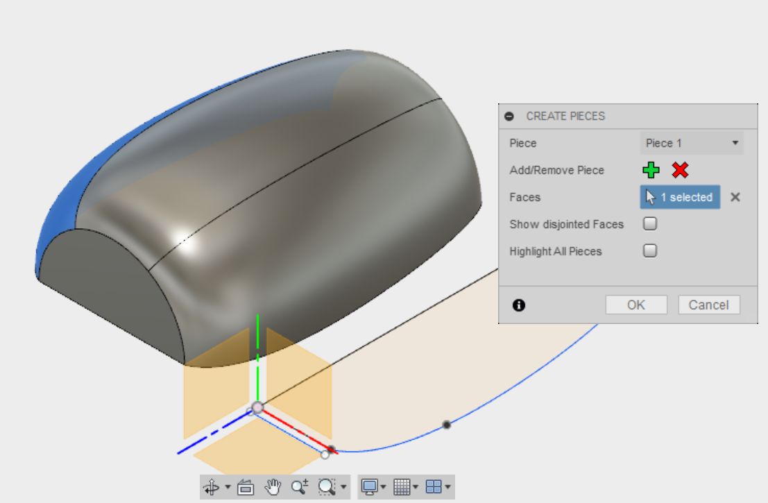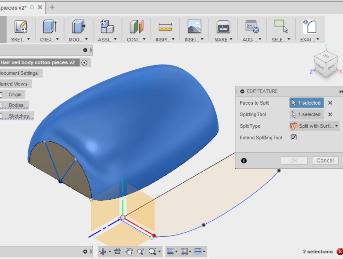 - In Fusion I sketched two lines as a radius on the half circle that forms the bottom of the cell; one with an angle of 120 and one with an angle of 60 degrees. I used the fuction split face to split the cell body in three pieces.