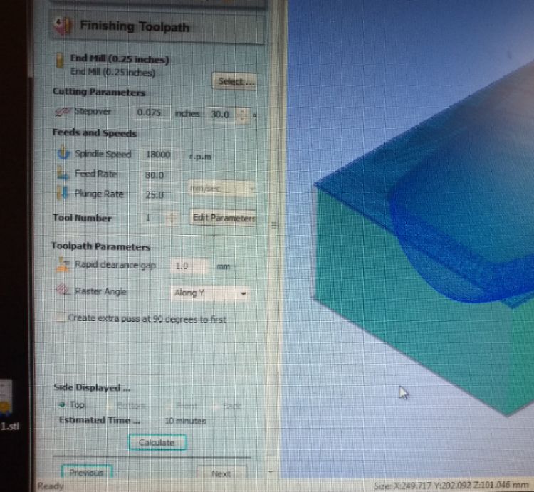- For the finishing toolpath I had to use the same endmill. I chose to do one extra layer in the Y-direction. This turned out to be useless.