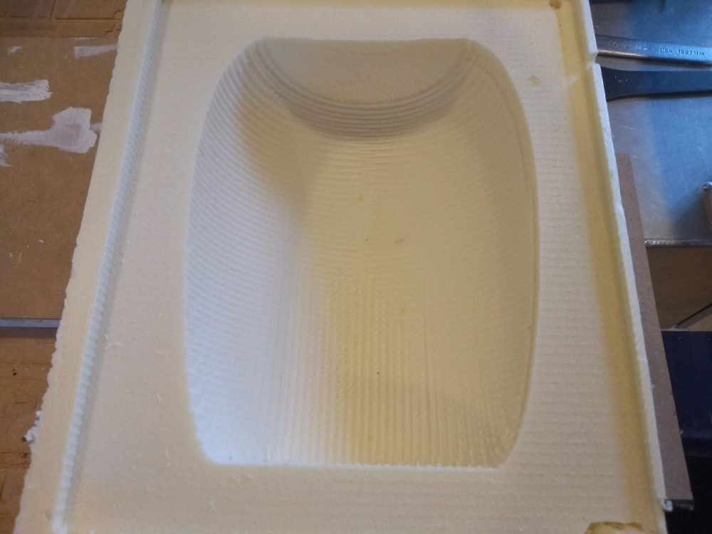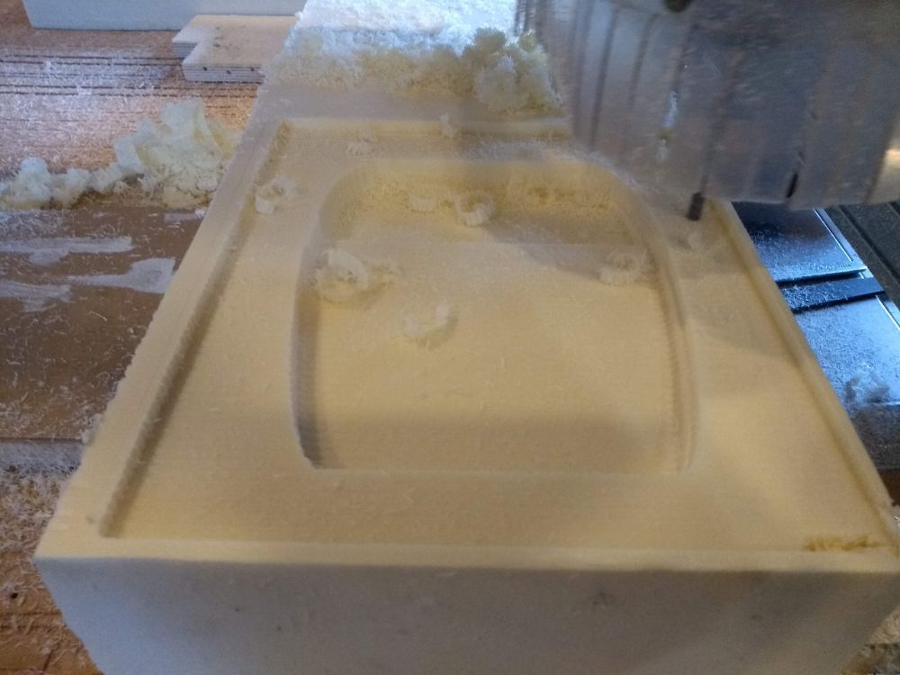 On may 28th I milled part 2 of the mold. I used the same workflow and settings as I did for part 1. Except that this time I did not forget to set the X/Y origin. And that I put double sided tape this time. The strange thing is that again the ShopBot seemed to shift the file in the Y-direction, halfway the process. What is also strange is that the calculation told me the roughening toolpath should take 46 minutes and the finishing toolpath 7. But it was 2 hours and 9 minutes later before the machine was finaly finished. From the pictures below you can see that the result is not really smooth. This is partly because I had to use a very long endmill, for my mold is deep/high. The only end mill in the lab was a 1/4 inch (6,38 mm) end mil that I had to use for the finishing toolpath as well. But mostly it is because I chose a stepover of 30%. that means thet the endmill has an overlap of 70%. I saw in Henk's design, that he used a stepover of 12% and got a much smoother result. I should have done that.